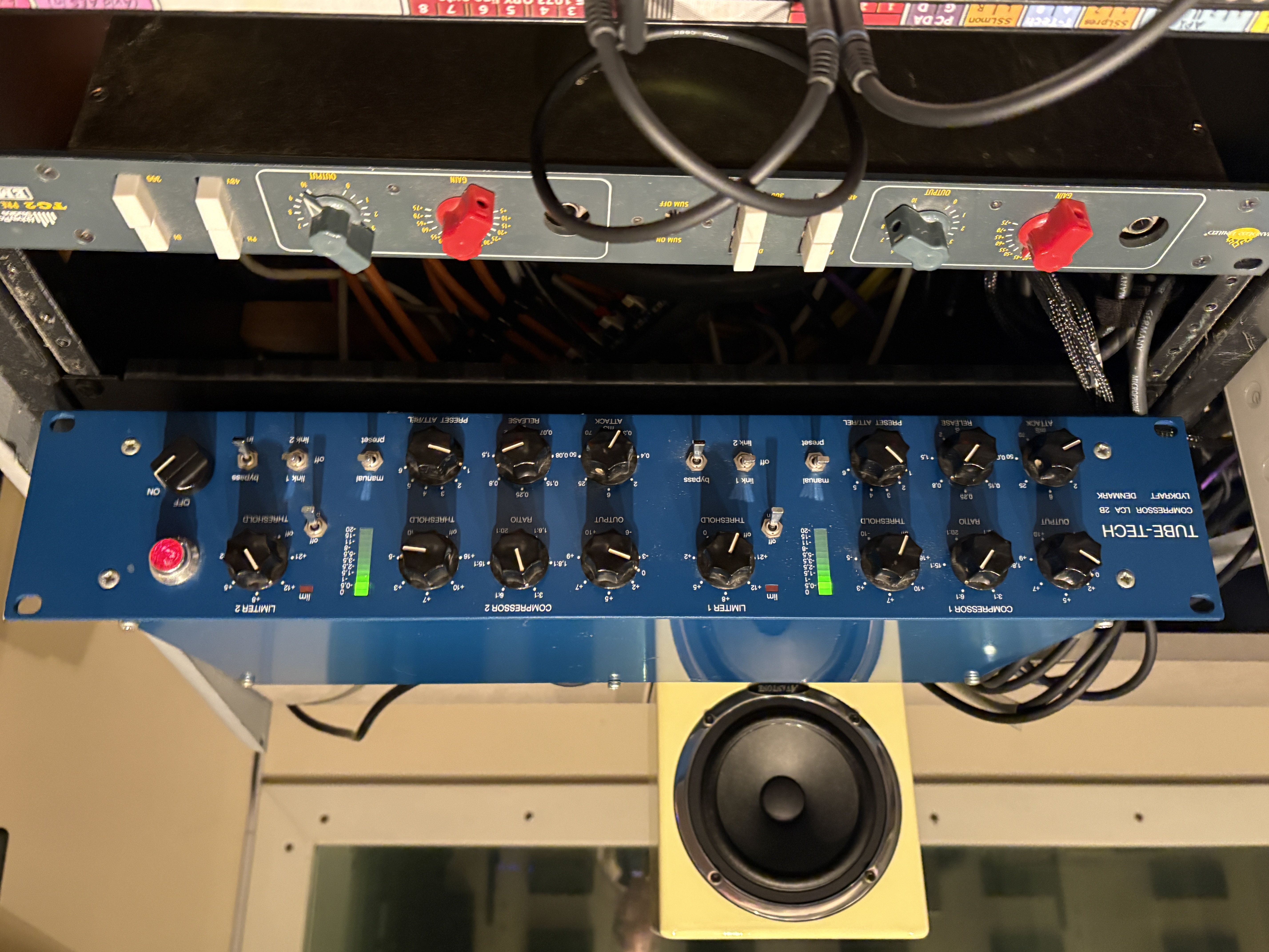 The Tube Tech LCA2B is a dual channel compressor. It is analog and has tubes in it. I believe there are XLR inputs and outputs in the back. It is a rackable effect unit and each has a digital meter.