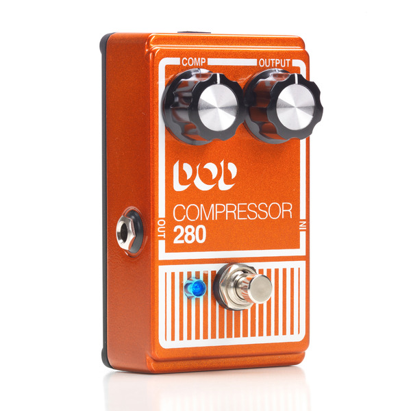 La DOD 280 Compressor édition 2014 utilise un circuit électro-optique qui fait varier la quantité de compression grâce à un capteur et une LED. Avec des réglages modérés, le contrôle Comp ajoute un effet de leveling du signal subtil, mais si vous le poussez, l’attaque initiale est “écrasée” et le niveau des notes et des accords que vous jouez se voit augmenté lorsque ceux-ci déclinent.