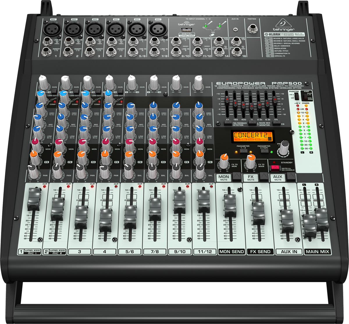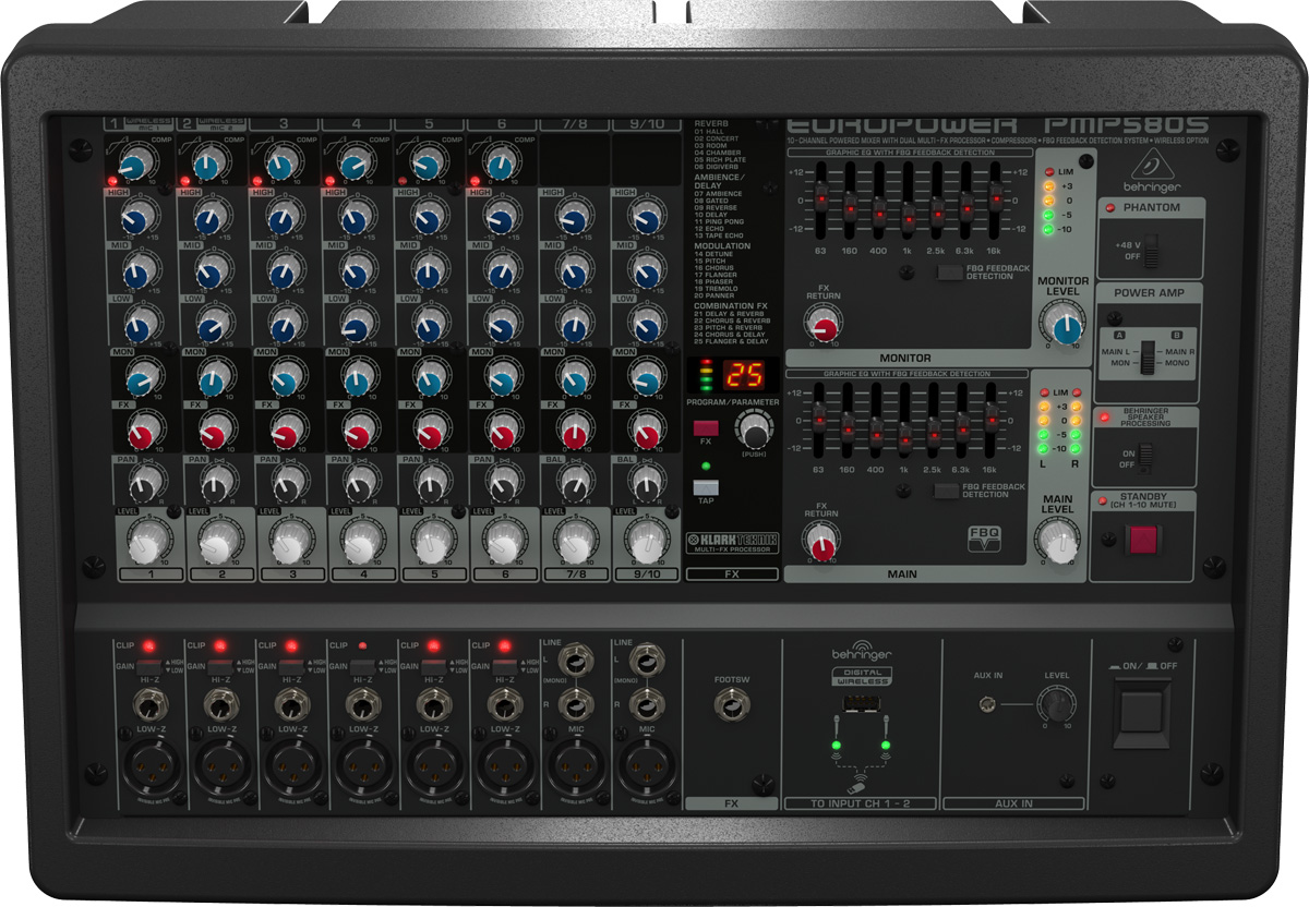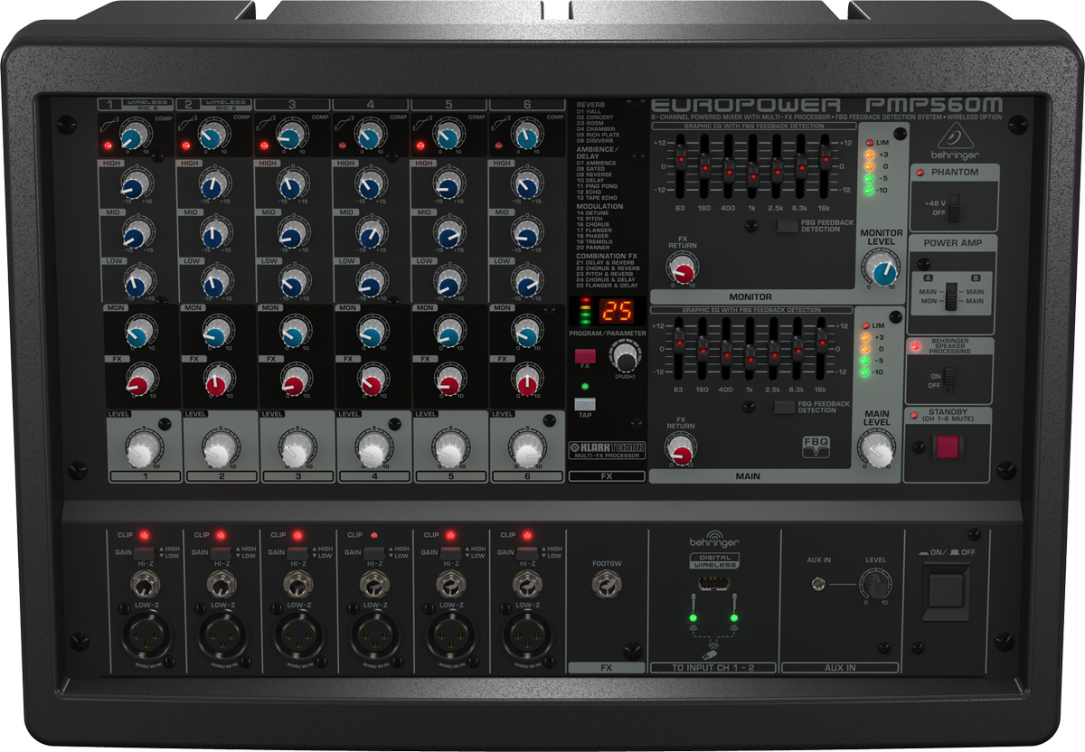 Les nouvelles consoles Behringer PMP sont capables de communiquer sans fil sur la bande de fréquence 2.4GHz et intègrent toutes les processeurs multi-effets numériques développés par Klark Teknik, avec 25 presets de réverbe, chorus, flanger, délai, pitch shifter… ainsi que le système de détection de larsen FBQ breveté par Behringer.