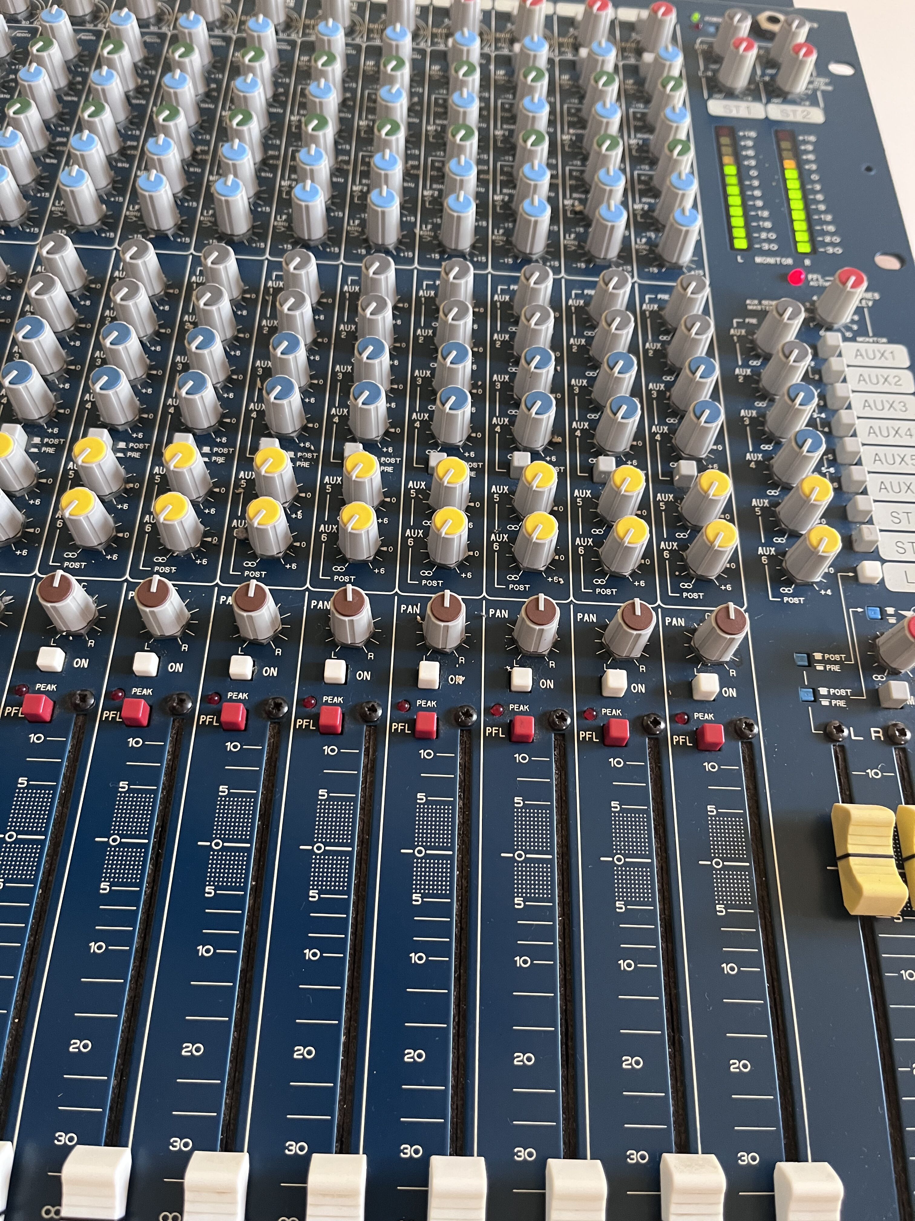 Console achetée années 2000, jamais sortie, tout fonctionne parfaitement, bandeau avec les numéros de pistes abimé et avec des traces de colles (cause adhésif)Console analogique 16 voies:
