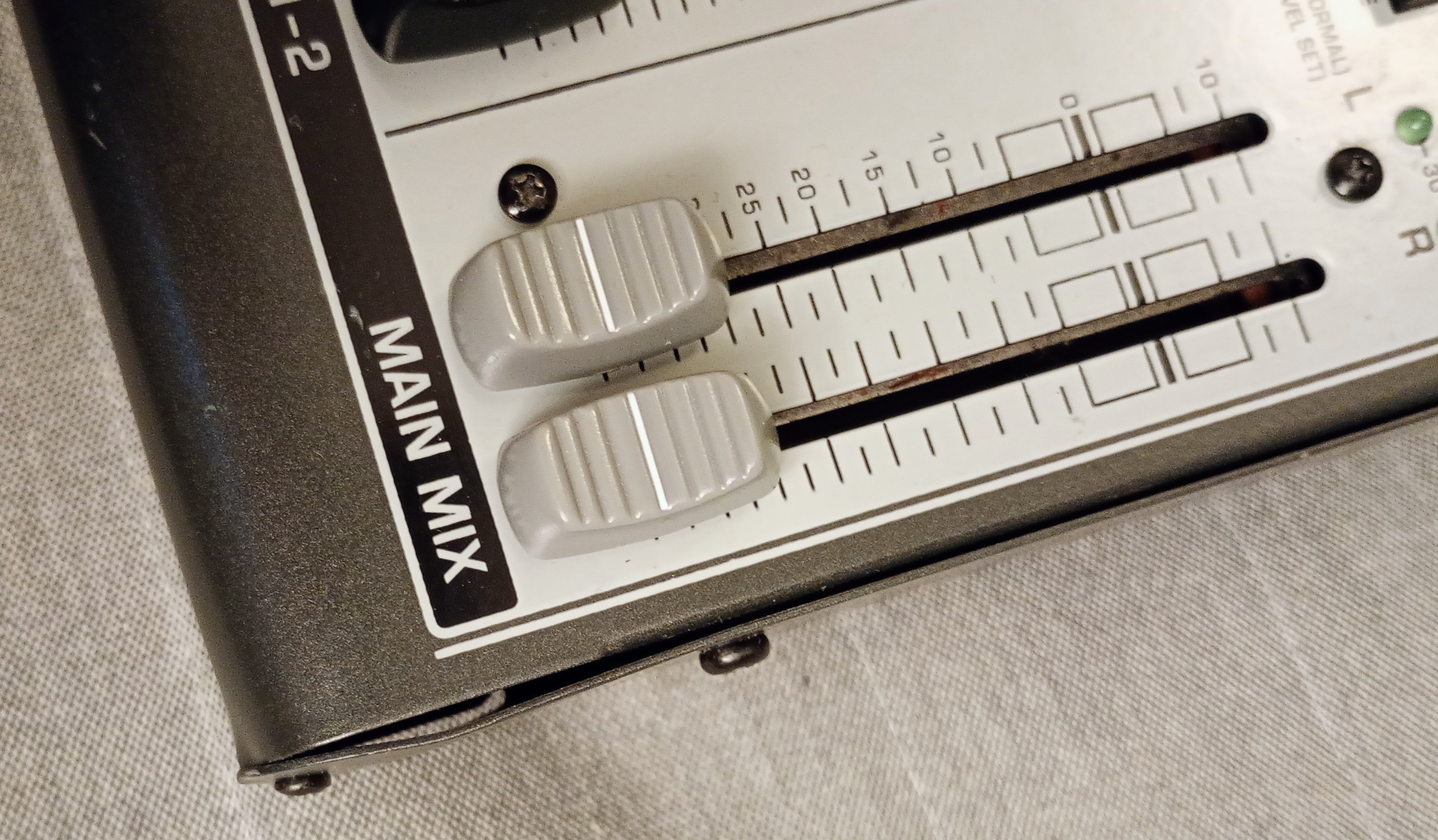 Je spécifie tout cela par principe (ce qui est bien naturel dans le cadre d'une transaction) mais je me répète : concrètement, la table est fonctionnelle en l'état. Il n'y a pas de pièces à changer. Quand je parle de "faux contacts", je précise que le son ne coupe pas brutalement - quelques switchs sont un peu capricieux ; au moment des réglages il faut parfois rappuyer plusieurs fois ou augmenter brièvement le volume de la tranche concernée, et ça ne bouge plus une fois le bon réglage trouvé (que ce soit à bas ou à fort volume). Toute la connectique ainsi que les faders et les potentiomètres sont OK !