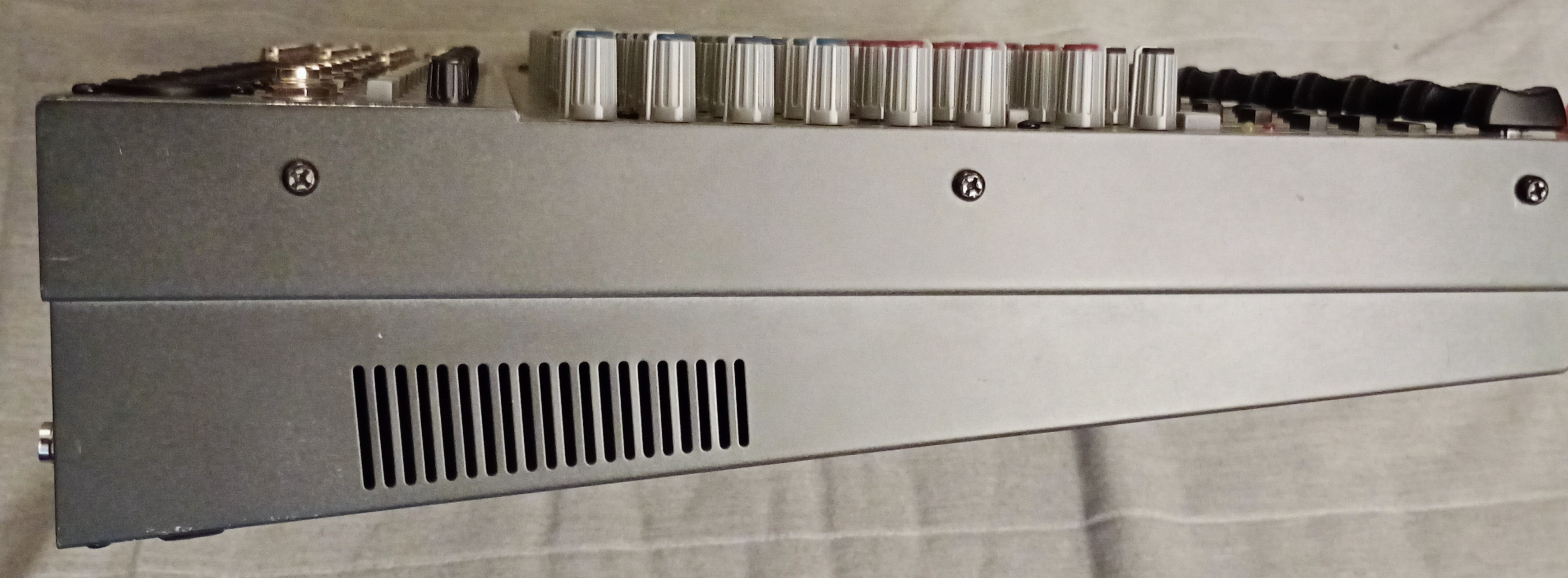 Je mets en vente ma console de mixage de marque Behringer : série Xenyx, modèle 2222FX. Entièrement analogique (seule la section d'effets est numérique) il s'agit ici d'un modèle sans connexion USB. Achetée d'occasion, elle est globalement en bon état et tout à fait utilisable telle quelle mais j'ai préféré indiquer "état correct/satisfaisant" à cause de quelques défauts listés ci-dessous (dont le prix tient évidemment compte) pour une totale transparence. Câble d'alimentation standard fourni (environ 1,80m). Je ne possède plus les équerres de montage en rack ni la boîte/doc d'origine mais je la vends avec un emballage cartonné adéquat (qui appartenait à une autre table de mixage). Plus de photos et de détails sur demande.Concernant l'aspect esthétique global, hormis quelques rayures et une légère déformation du panneau latéral bas/droit (cf. photo) l'état général est plutôt bon. Il manque 2 des 4 patins en caoutchouc au-dessous. Autrement pas de casse, ni de pièces ou de vis manquantes. À noter qu'en retournant la table, on peut entendre une minuscule pièce se balader à l'intérieur (ne sachant pas démonter le panneau avant, je n'ai jamais pu l'extraire mais ça n'a jamais gêné l'utilisation). J'ai cependant nettoyé et dépoussiéré l'extérieur.