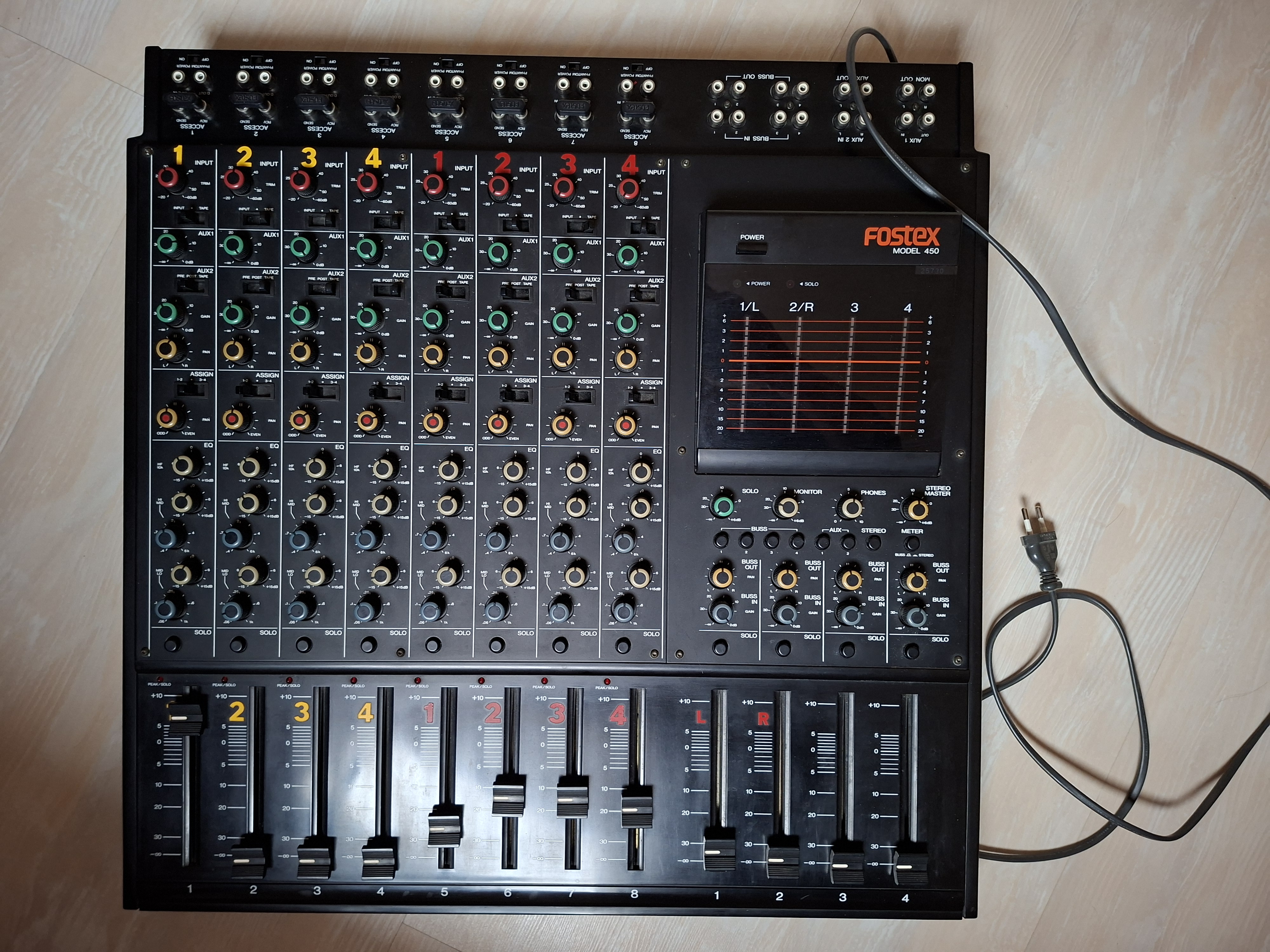 les 4 bus sont équipés d'une entrée et d'une sortie rca qui permettent de rentrer des effets ou bien d'attaquer directement une carte son ou quelquonque enregistreur, ce qui n'est tout de même pas négligeable. Chacun d'eux possédent un panoramique et un gain. Ils sont envoyés sur la sortie moniteur et sur la sortie L R.