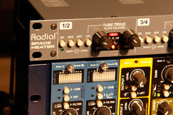 Annoncé aux USA au tarif de $1699,99, le Space Heater vous permet de combiner 8 canaux audio et d’y appliquer une overdrive à lampe. Radial explique que le module rackable de 1U de hauteur a subi quelques modifications depuis sa présentation en début d’année suite à la découverte d’anomalies avec l’utilisation des lampes : le circuit original présentait un contrôle d’entrée et de sortie pour chaque paire de canaux, Radial utilisait une lampe 12AX7 pour deux canaux mais durant les beta tests, ils ont constaté des variations significative en sortie des tubes. Ils ont donc repensé le circuit et cette nouvelle version comprend donc toujours 4 lampes, mais désormais un contrôle d’entrée et de sortie pour chaque canal, avec de nouveaux potentiomètres concentriques. Les 8 canaux peuvent être utilisés séparément ou sommés dans un bus stéréo.