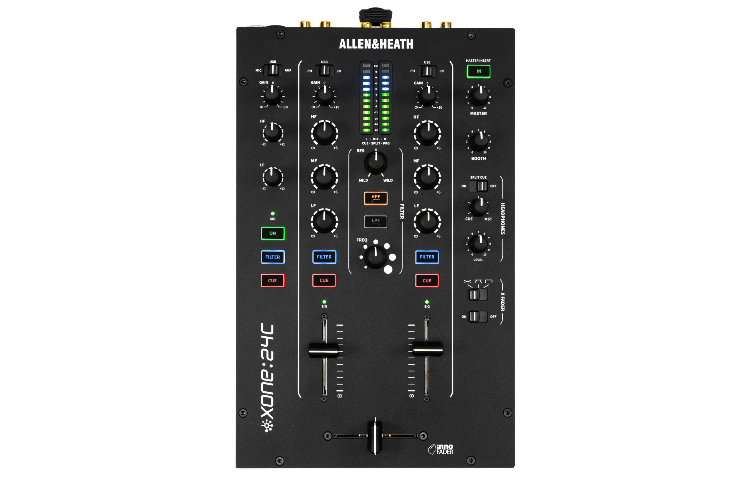 On retrouve également un point d’insert stéréo sur le Master (RCA), 2 paires d’entrées phono/ligne (TRS et RCA), une paire d’entrées auxiliaires (RCA), une entrée micro (XLR) avec filtres passe-haut et passe-bas dédiés mais aussi une paire de sorties Master (XLR), une paire de sorties Booth (RCA) et une paire de sorties Record (RCA).