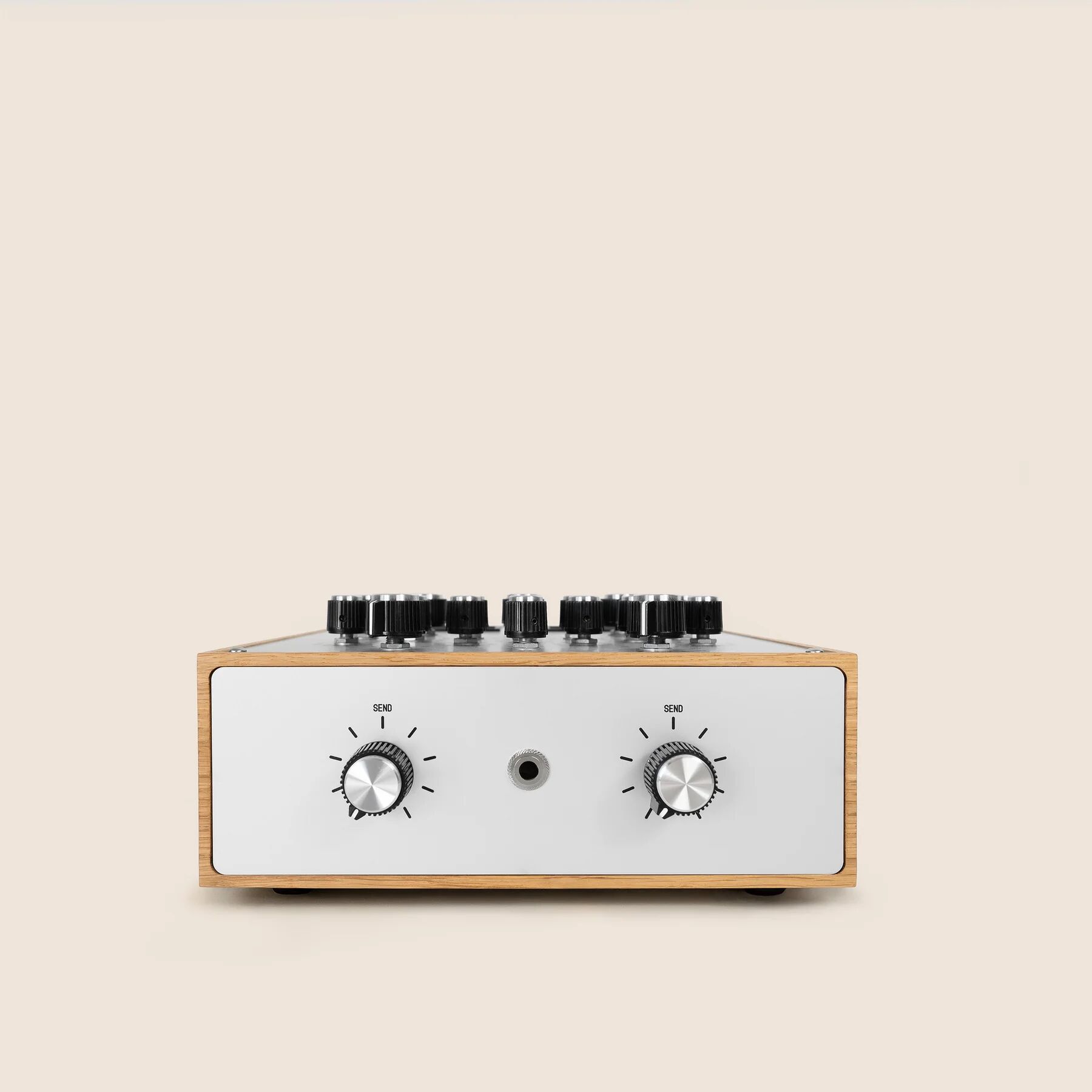 En termes de connexions, vous retrouverez deux entrées phono + ligne stéréo (RCA), une sortie stéréo Master (XLR + RCA), une sortie stéréo Booth (TRS), une sortie stéréo Record (RCA) et deux boucles d’effet stéréo (RCA). La table est munie de deux VU-mètres analogiques, et le constructeur propose des finitions personnalisables pour le châssis et la façade.