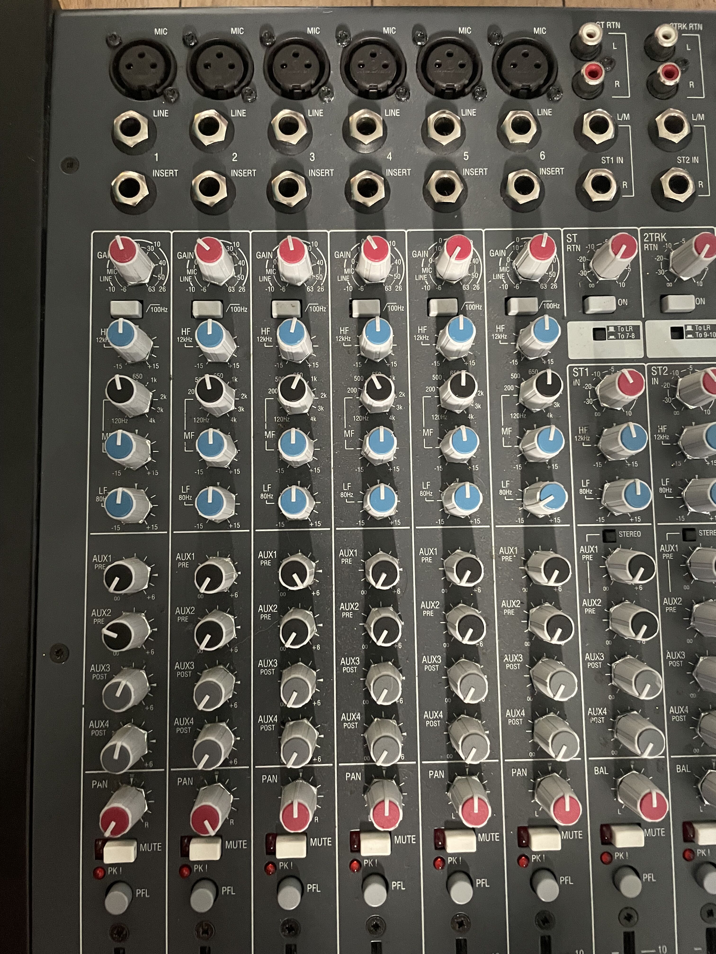 La table est plutôt complète, surtout pour la gamme de prix. Des faders LONGS (et précis), au nombre de 12 : 6 entrées mono XLR ou jack avec insert, 4 stéréo et le double fader master. Coupe bas à 100 Hz pour les entrées mono. Les gains sont suffisant, on pourrait espérer peut-être un poil plus de marge mais c'est déjà confortable. Les EQ m'ont l'air plus efficaces que celles que j'ai maniées avec mes Soundcraft antérieures (après elles étaient d'entrée de gamme, séries Spirit et MPMi). A mon sens il manque le 48 V disponible par tranche (il y a un seul bouton pour l'activer partout ou nulle part) et des boutons Solo (PFL uniquement). L'ensemble est solide, tient bien en place, et l'ergonomie est classique.