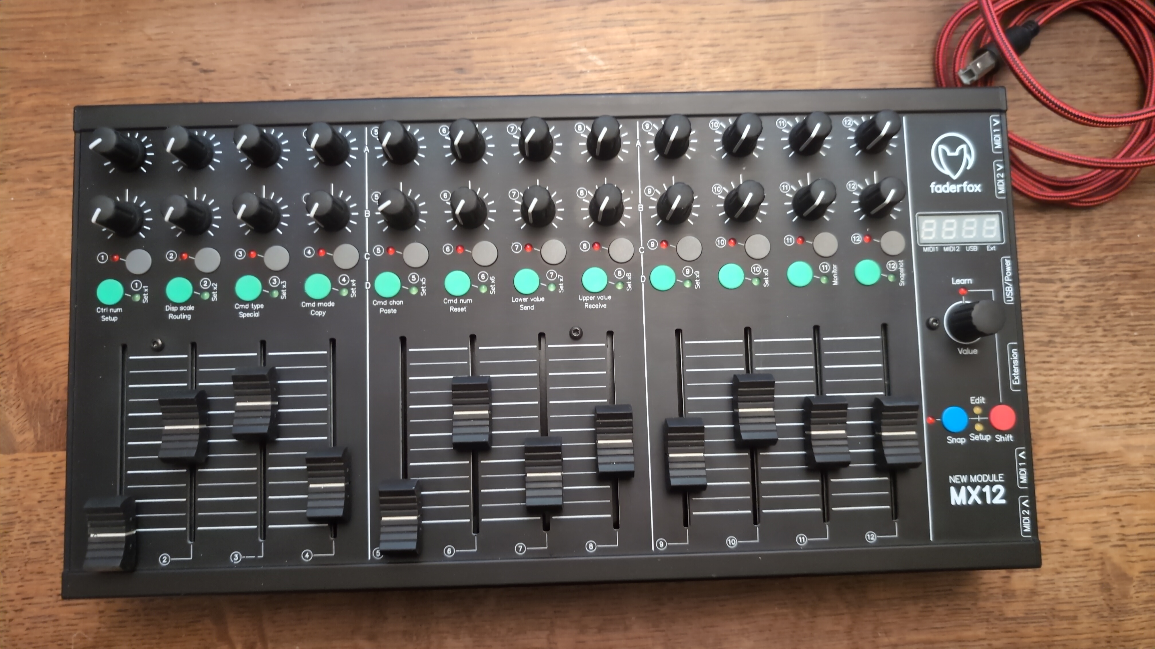 - 12 Faders (60mm) and 24 pots with rubber knobs and standard midi resolution of 7bit