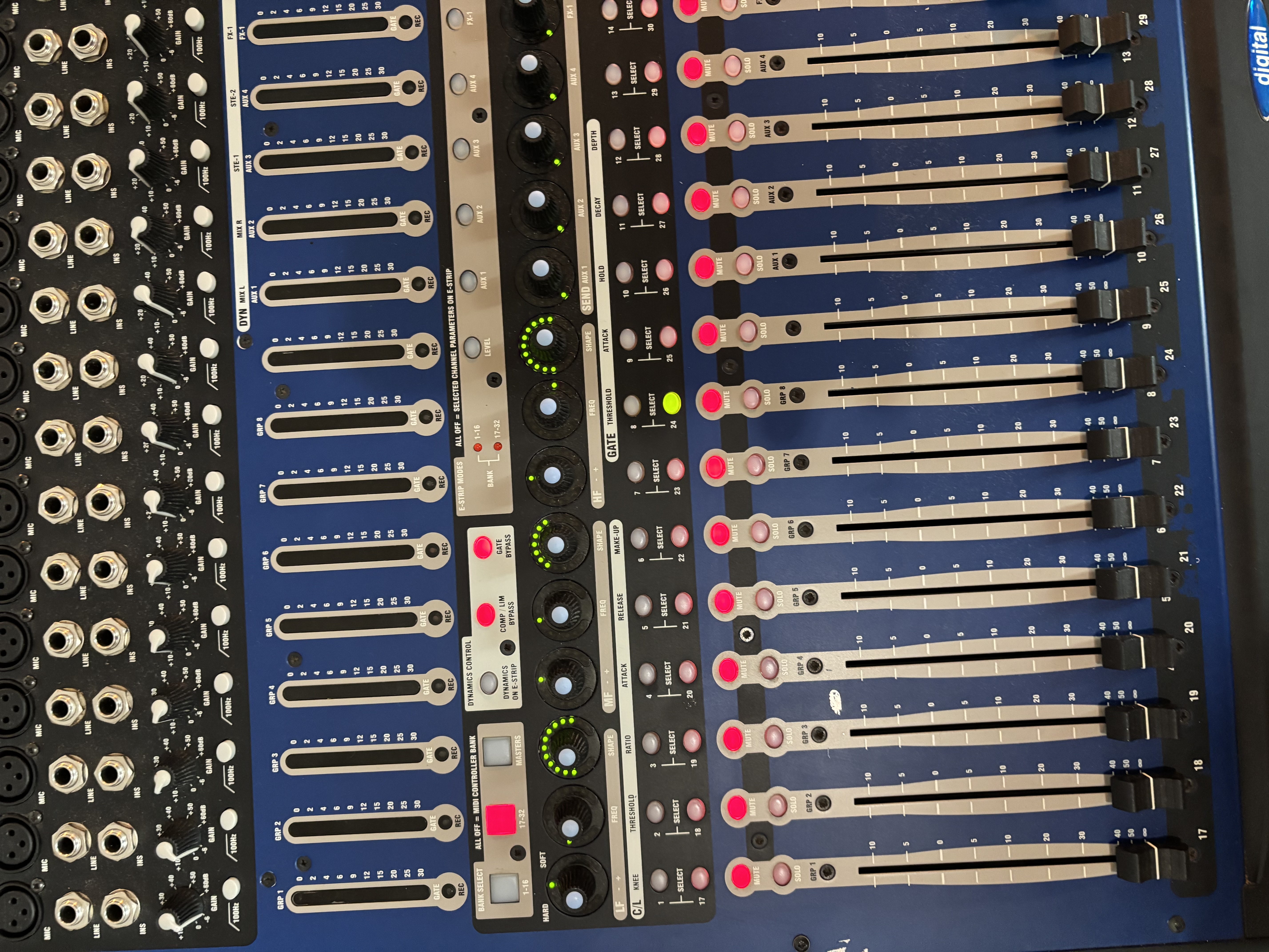 Yep, full paramétrique sur les 3 bandes, et ce sur les 16 pistes mic/lines comme adat/tdif, applicables aussi sur les entrées stereo, fx, etc chaque canaux disposent aussi d'un compresseur(knee threshold, ratio, attack release et gain) et d'un gate (threshold attack, hold, decay, depth).
