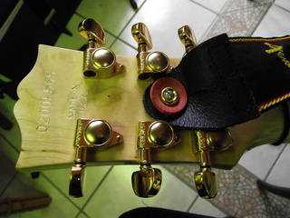 Pour éviter que son instrument chéri tombe par terre quand la sangle se détache de la guitare, il suffit d'insérer entre la sangle et le bouton d'attache une rondelle en caoutchouc (pour bouteille de limonade) que l'on trouve dans toutes les bonnes quincailleries.