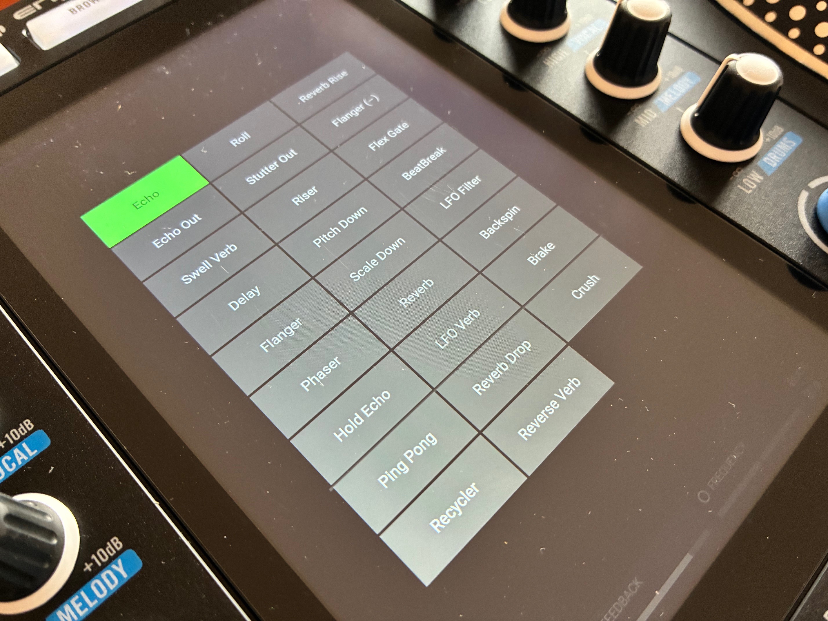 Précision importante : en restant appuyé sur n’importe lequel des six boutons, on peut modifier l’effet chargé, et en choisir un nouveau parmi une liste beaucoup plus aboutie, qui comporte pas moins de vingt-six options différentes présentées directement sur l’écran. Au programme, vous retrouverez les algorithmes suivants : Echo, Ping Pong, Reverb, BeatBreak, Recycler, LFO Verb, LFO Filter, Swell Verb, Roll, Reverb Drop, Backspin, Delay, Stutter Cut, Reverse Verb, Brake, Flanger, Riser, Reverb Rise, Crush, Phaser, Pitch Down, Flanger (-), Hold Echo, Scale Down et Flex Gate. Bien que limités en termes de réglages, on comprend très vite après quelques minutes d’utilisation que tous ces effets sont parfaitement calibrés pour une prestation en direct (on retrouvait d’ailleurs déjà les mêmes propositions sur le contrôleur Rane Four, si nos souvenirs sont exacts). Gros coup de cœur de l’équipe pour les effets Recycle et Riser qui sonnent merveilleusement bien, et proposent un rendu toujours très musical dans à peu près n’importe quelle situation. La seule petite déception concerne la qualité de l’algorithme de réverbération, qui manque un peu de profondeur et de densité selon nous, mais c’est sans doute une affaire de goût. En tous cas, rien de rédhibitoire, bien au contraire.