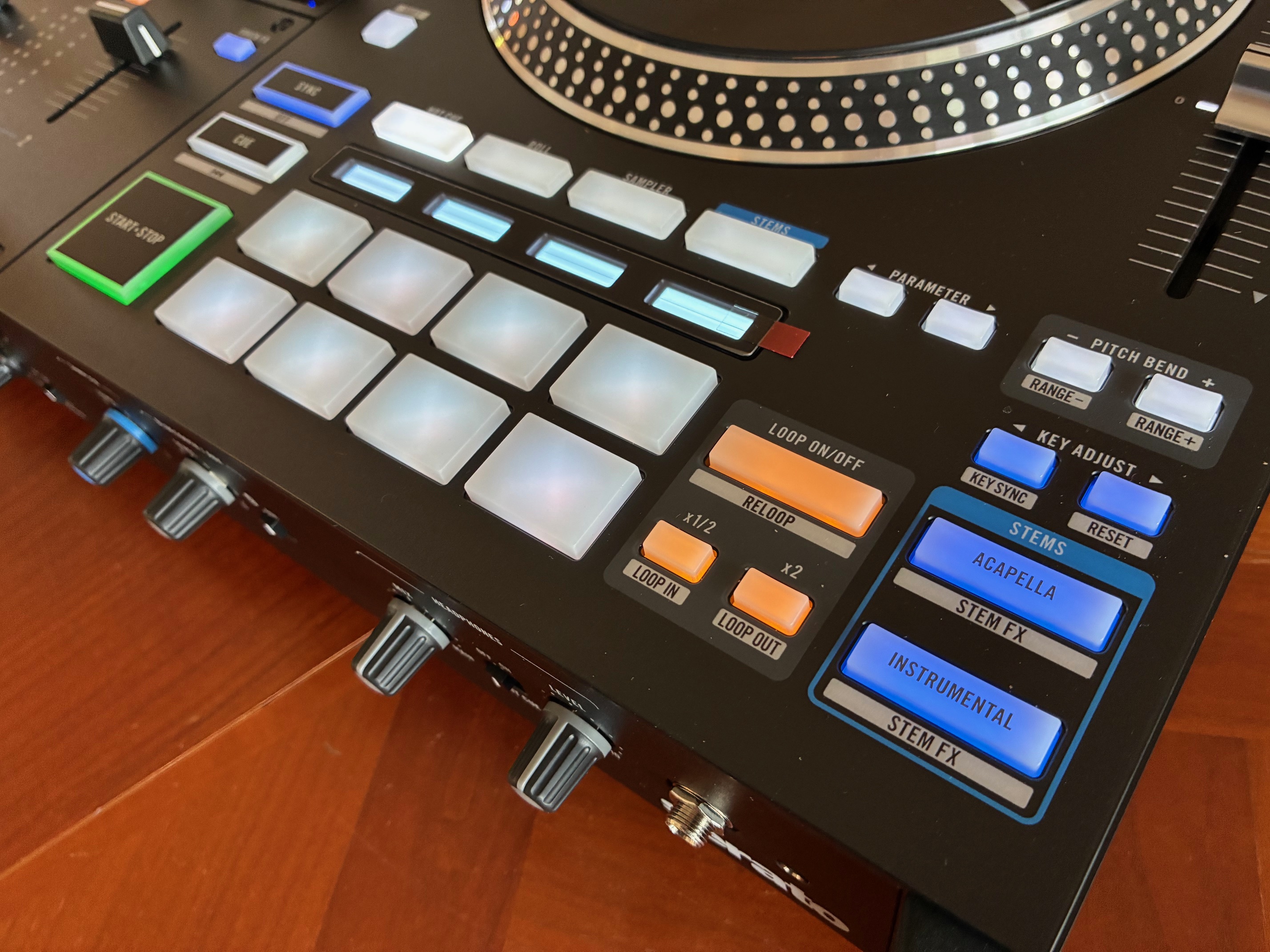 On poursuit avec les huit pads rétroéclairés qui sont munis de quatre boutons pour la sélection du mode de jeu (Hot Cue, Roll, Sampler et Stems) et de leur mini-écran individuel (qui semblent être exactement les mêmes que ceux qu’on retrouvait déjà sur le modèle Rane Performer). Ces écrans sont très pratiques et permettent de toujours savoir quelles fonctions sont assignées aux pads. D’ailleurs, petit coup de cœur de toute l’équipe pour la fonction Stem Fx qui permet d’appliquer des effets de manière indépendante sur chacun des quatre stems (Vocal FX, Melody FX, Bass FX et Drums FX).