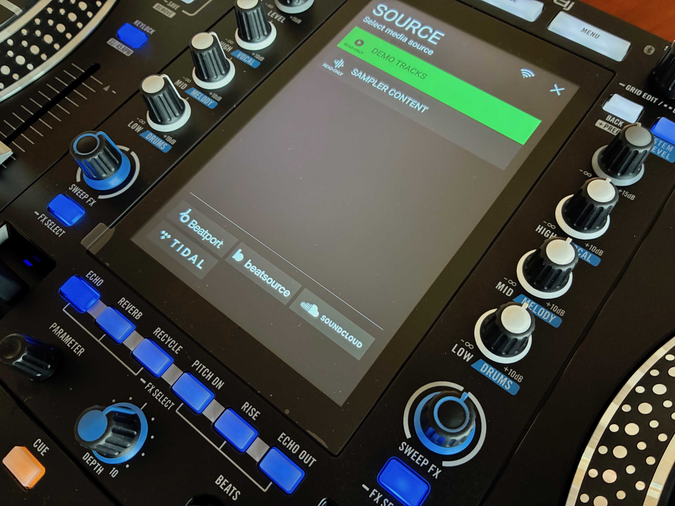 Comme vous le savez sans doute, le moteur sonore du contrôleur est assuré par le logiciel Engine DJ, et la gestion des morceaux et playlist est effectuée par le système OmniSource. Ce système permet de naviguer dans la bibliothèque et les playlists en faisant appel à des pistes audio issues de tous les supports, sans distinction, qu’il s’agisse d’une clef USB ou d’un disque dur, d’un flux issu des services de streaming (Apple Music, Amazon Music Unlimited, Tidal, Beatport, Beatsource, SoundCloud Go+), de fichiers sauvegardés sur le cloud (Dropbox), ou bien encore de sessions préparées sur les logiciels compatibles (Serato DJ Pro, Algoriddim djay, etc.). Profitons-en pour rappeler au passage qu’une licence Serato DJ Pro est fournie avec la machine. Sur la partie supérieure gauche de la section mixeur se trouve le bouton Source, en appuyant dessus, l’ensemble des médias/sources connectées à l’appareil s’affichent et ensuite, c’est à vous de jouer !