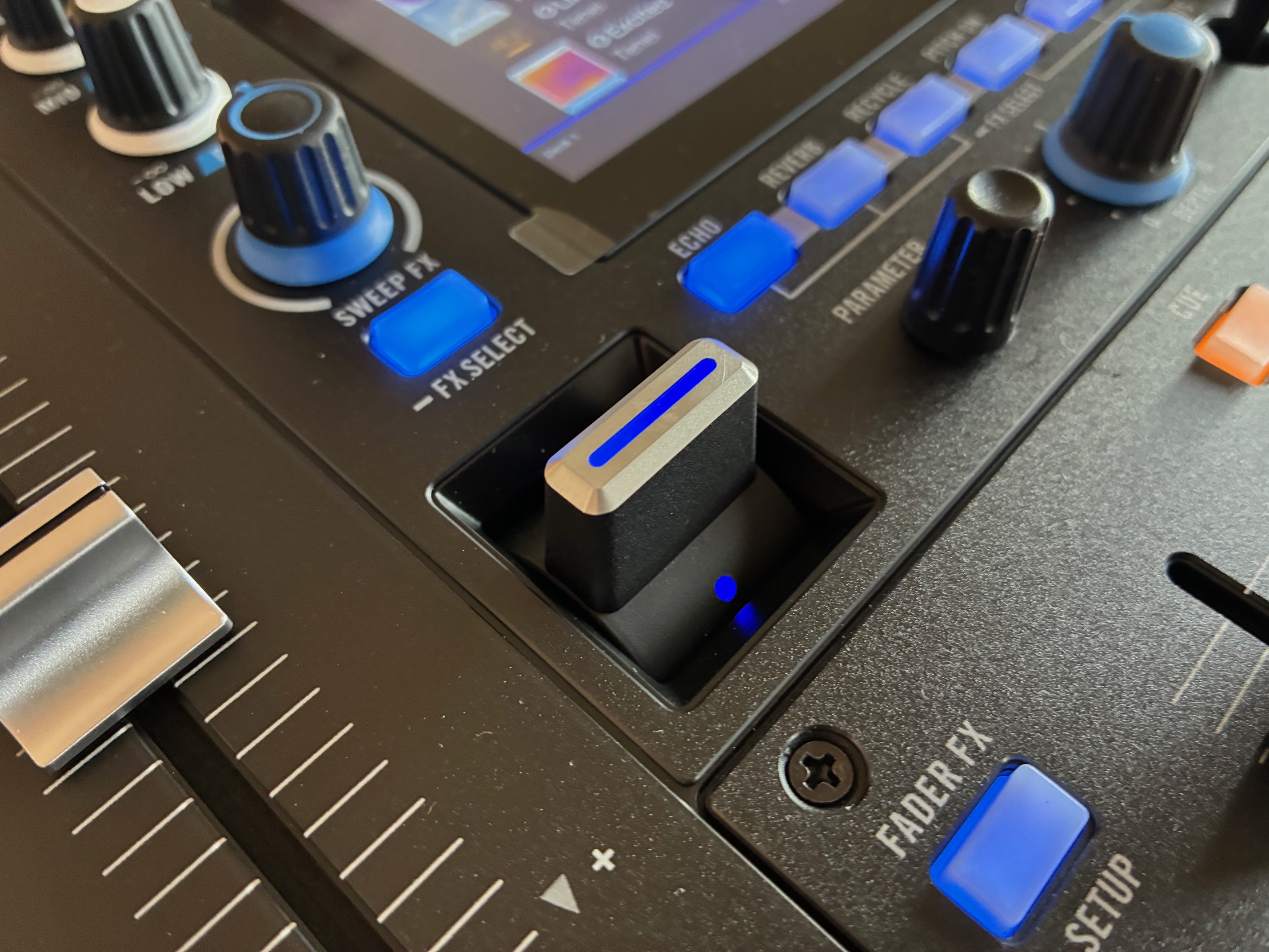 Mais ici encore, ce n’est pas tout : en dessous de l’écran central se trouve la section d’effet globale avec six boutons (Echo, Reverb, Recycle, Pitch DN, Rise, Echo Out) dédiés à la sélection d’autres traitements. Ils sont complétés par deux encodeurs pour les régler (Parameter et Beats), et un potentiomètre central pour doser l’intensité de l’effet (Depth). Mais les éléments les plus intéressants ici sont les deux mini-curseurs à ressorts qui permettent de les déclencher à la volée. C’est un système très pratique pour créer des variations soudaines et surprendre l’auditoire. Bien joué, Rane !