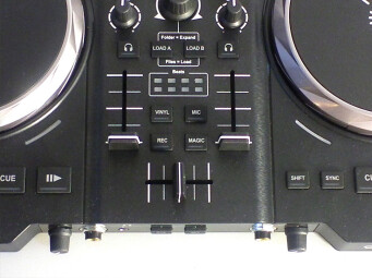 On a un fader de volume par voie dont la « dureté » est correctement ajustée. Il n’est pas possible de régler leur courbe de volume (ni de les inverser) : c’est progressif de façon linéaire, ce qui convient à 90 % des DJs pour du mix. Le crossfader possède, lui, un réglage de la courbe (dans le logiciel) : elle est progressive par défaut et peut être ajustée pour le scratch en mode « ON/OFF ». Il n’est par contre pas possible d’inverser les voies (mode « Hamster »), ce qui n’est pas gênant, encore une fois, pour un usage sans scratch.