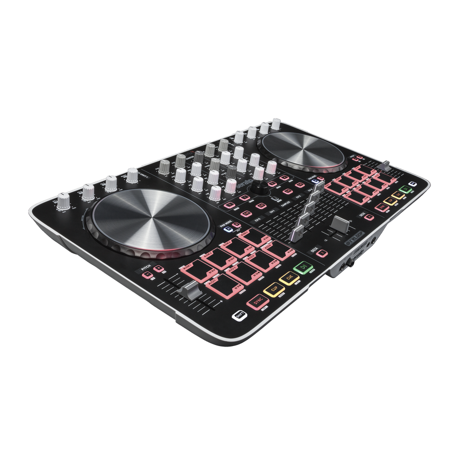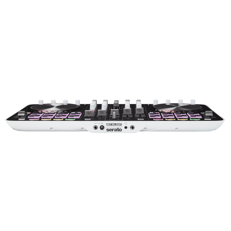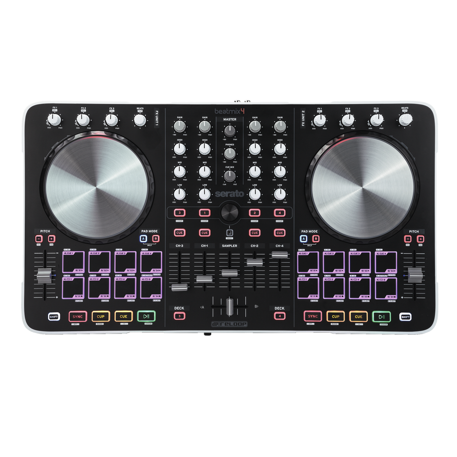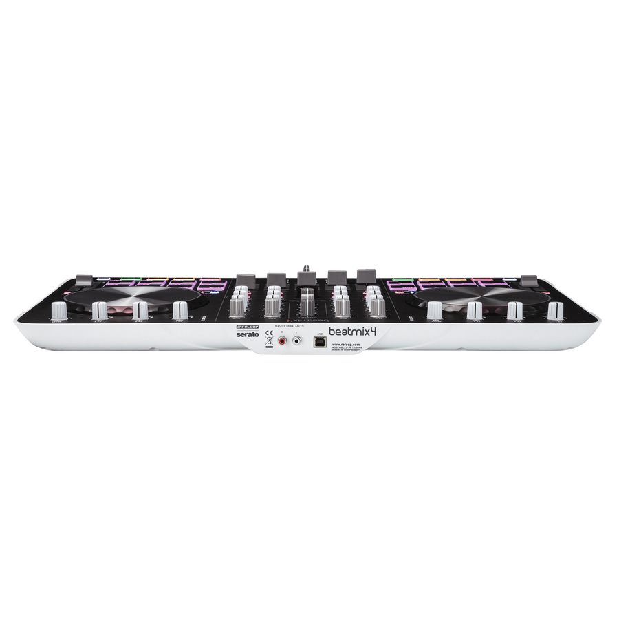 La Beat­mix 4 annonce clai­re­ment la couleur puisque la surface de contrôle pour DJ est estam­pillée Reloop et Serato. Avec ce modèle, Reloop se met au niveau des gros concur­rents en offrant un contrô­leur et mixer 4 canaux dotés de 2 × 8 drum pads multi­co­lores de 2.3cm de large, deux sections d’ef­fets propul­sés par iZotope (3 effets combi­nables simul­ta­né­ment) avec quan­ti­sa­tion, deux jogs de 14.4cm de diamètre avec indi­ca­teur à LED de la posi­tion de l’ai­guille virtuelle, ou encore une section contrôle du sampler de Serato avec un fader de volume, des pads pour lancer et arrê­ter les samples et un mode Split qui permet de contrô­ler en même temps les points cue et le déclen­che­ment des samples.