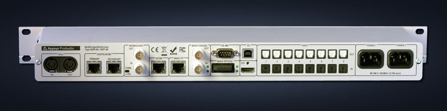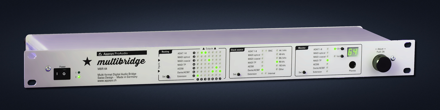 La nouvelle Appsys Multibridge MBR64 se présente sous la forme d’un rack 19“ 1U et permet de gérer les signaux audio numériques les plus populaires : ADAT, MADI optique, coaxial et TP, AES50, Dante/AES67, AES3 (via une breakbox) et de convertir jusqu’à 64 canaux.