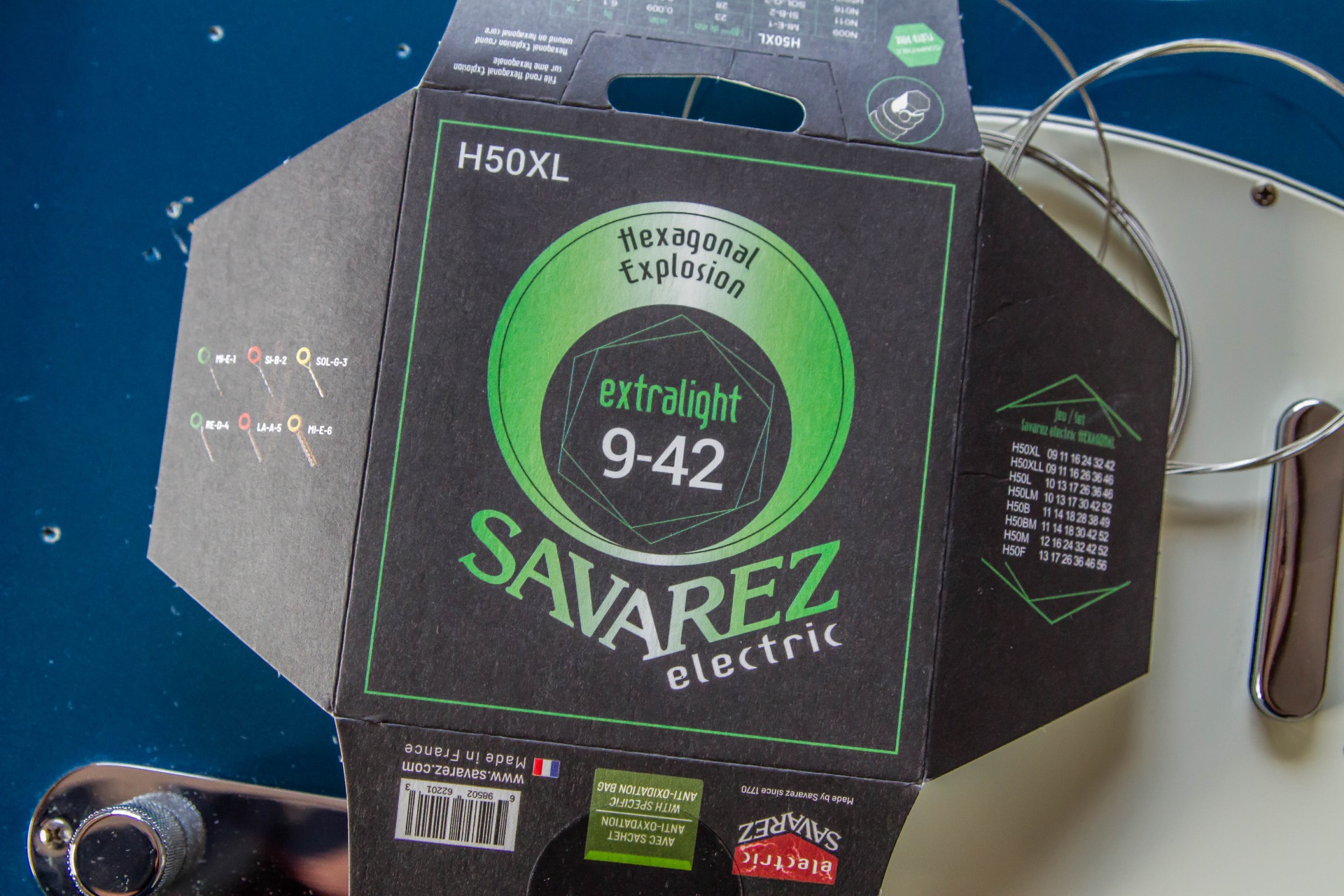 Les cordes Hexagonal Explosion de Savarez sont des cordes pour guitare électrique. Elles sont filées en métal et plaquées nickel sur une âme hexagonale. Cette méthode de fabrication optimise les qualités spécifiques du son et du toucher de l’âme hexagonale. Pour ce test, le fabricant français m’a fait parvenir un jeu en .009 – .042 à installer sur ma Fender Telecaster au diapason de 25,5 pouces. Ces cordes sont assez polyvalentes, la marque annonce même qu’elles sont idéales pour le Rock, la Funk, mais aussi le Blues. L’âme hexagonale associée au filetage spécifique garantissent un son plus rond, un excellent confort de jeu et une attaque et une justesse d’une grande tenue.