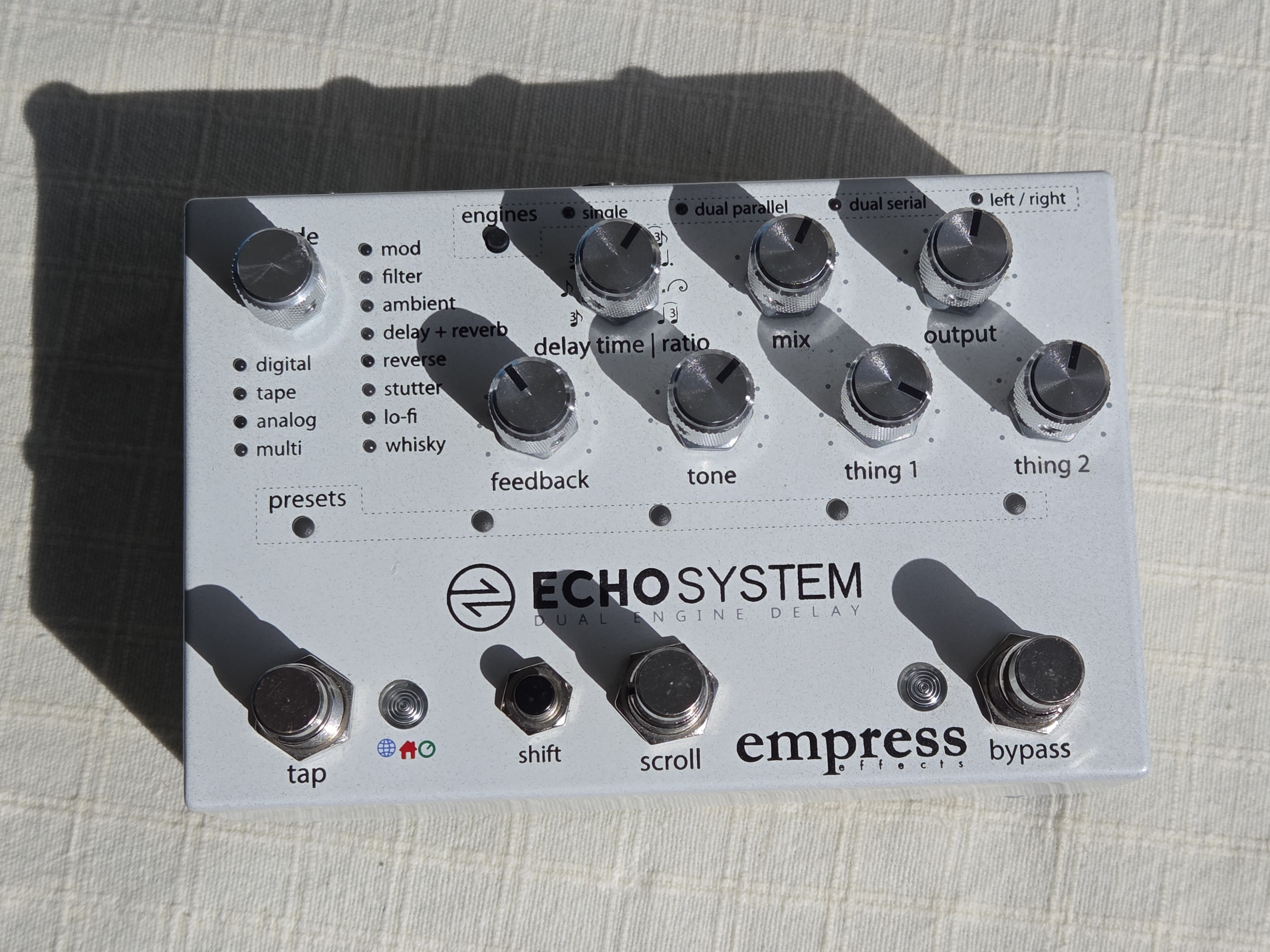 - tourner l'encodeur en haut à gauche permet de basculer d'un algo à l'autre (43 algos différents qui vont du classique au glitchy). On appuie dessus pour basculer les modes de delay: single (un seul delay, quelle surprise), dual parallel (les deux types de delays sont mélangés), dual serial (le premier rentre dans l'autre) et left/right (un delay de chaque côté).