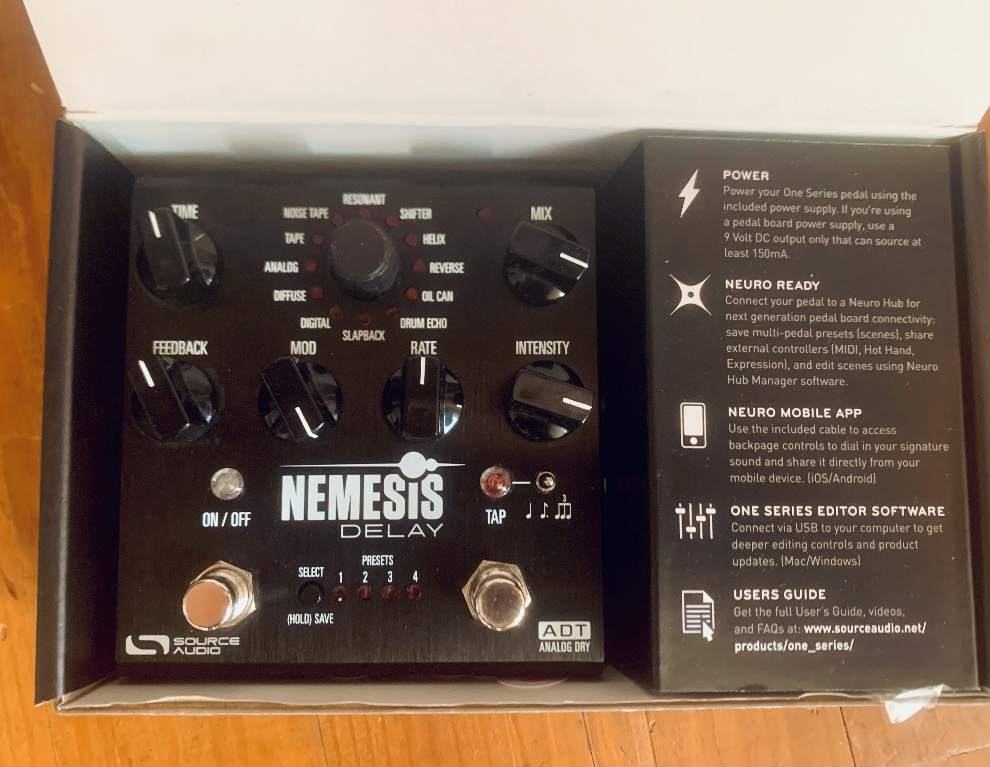 Source Audio NÉMÉSIS version ADT (version sortie en 2024 avec circuit « analog dry through » / seul le son traité est numérisé + nouveaux algorithmes (dont une dizaine supplémentaires via Neuro App sur ordi, smartphone ou tablette), DSP amélioré, sortie pédale jack TRS…). Câbles et accessoires jamais déballés (mini usb vers USB, câble d’alimentation). Jamais servie mais testée avant la mise en vente, RAS :-) Facture fournie de MAI 2025, garantie jusqu’en Mai 2027 donc.Remise en mains propres sur Rennes, Marseille, Paris ou Dinan, envoi possible.