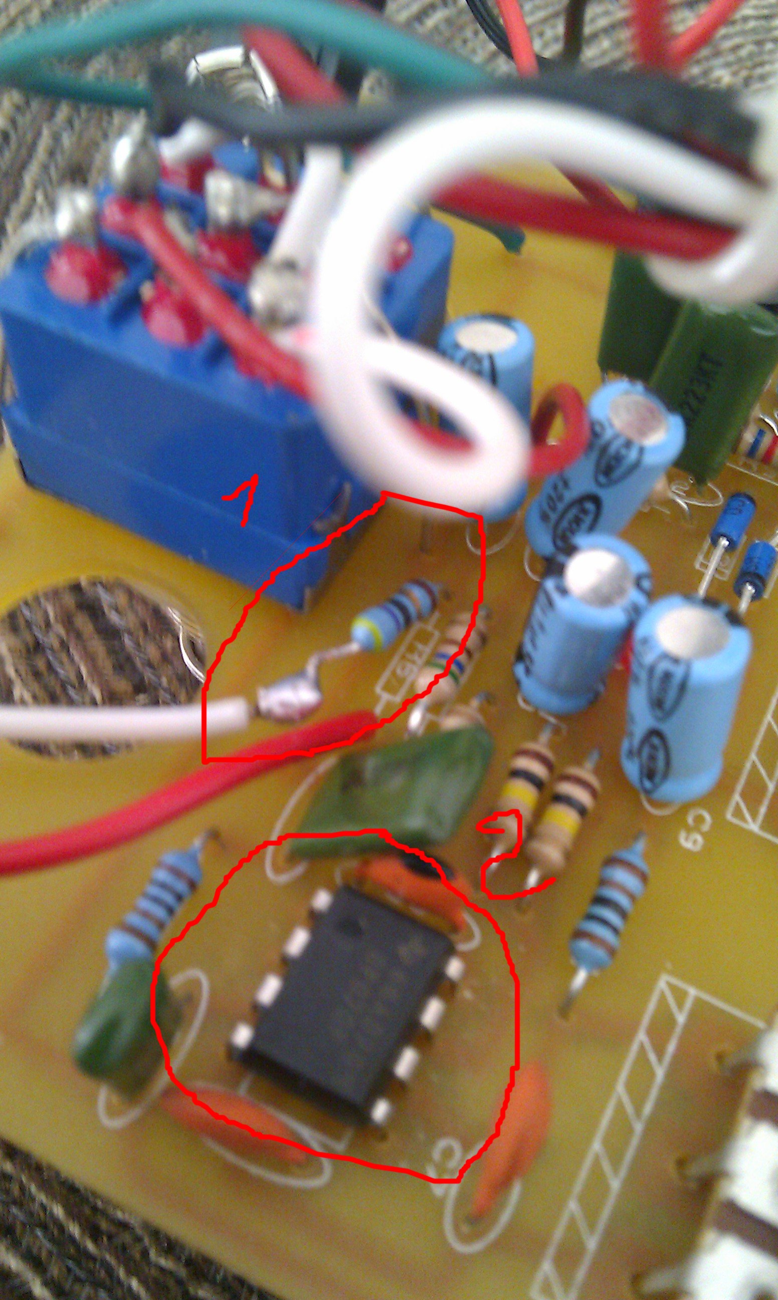 Il vous suffit de repérer la résistance R6 comme sur l'image entouré en rouge 1 (Attention cette modif est sur un modèle récent à partir de la ref : 30000 en dessous le CI est différent et donc il ne se trouve pas forcement au même endroit.)