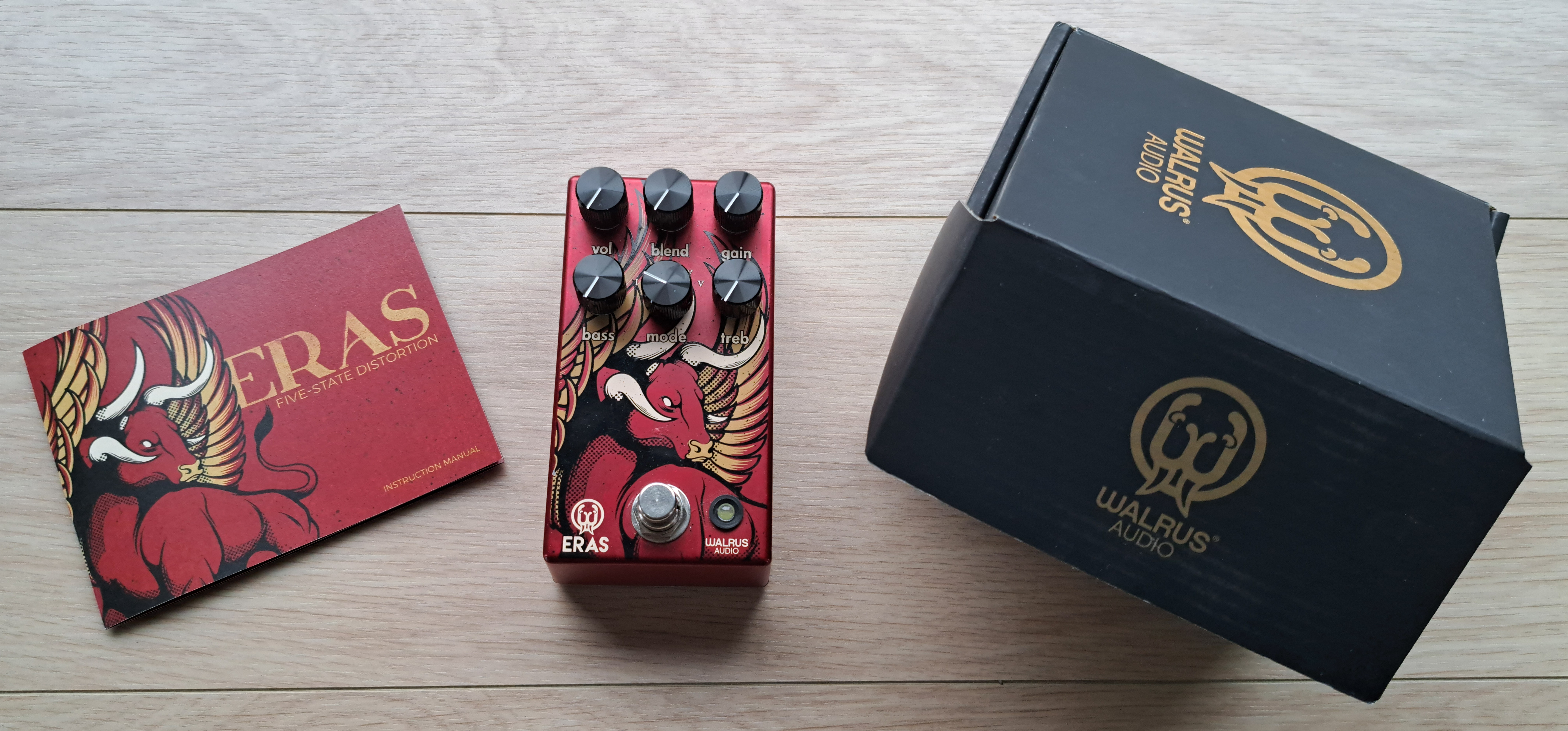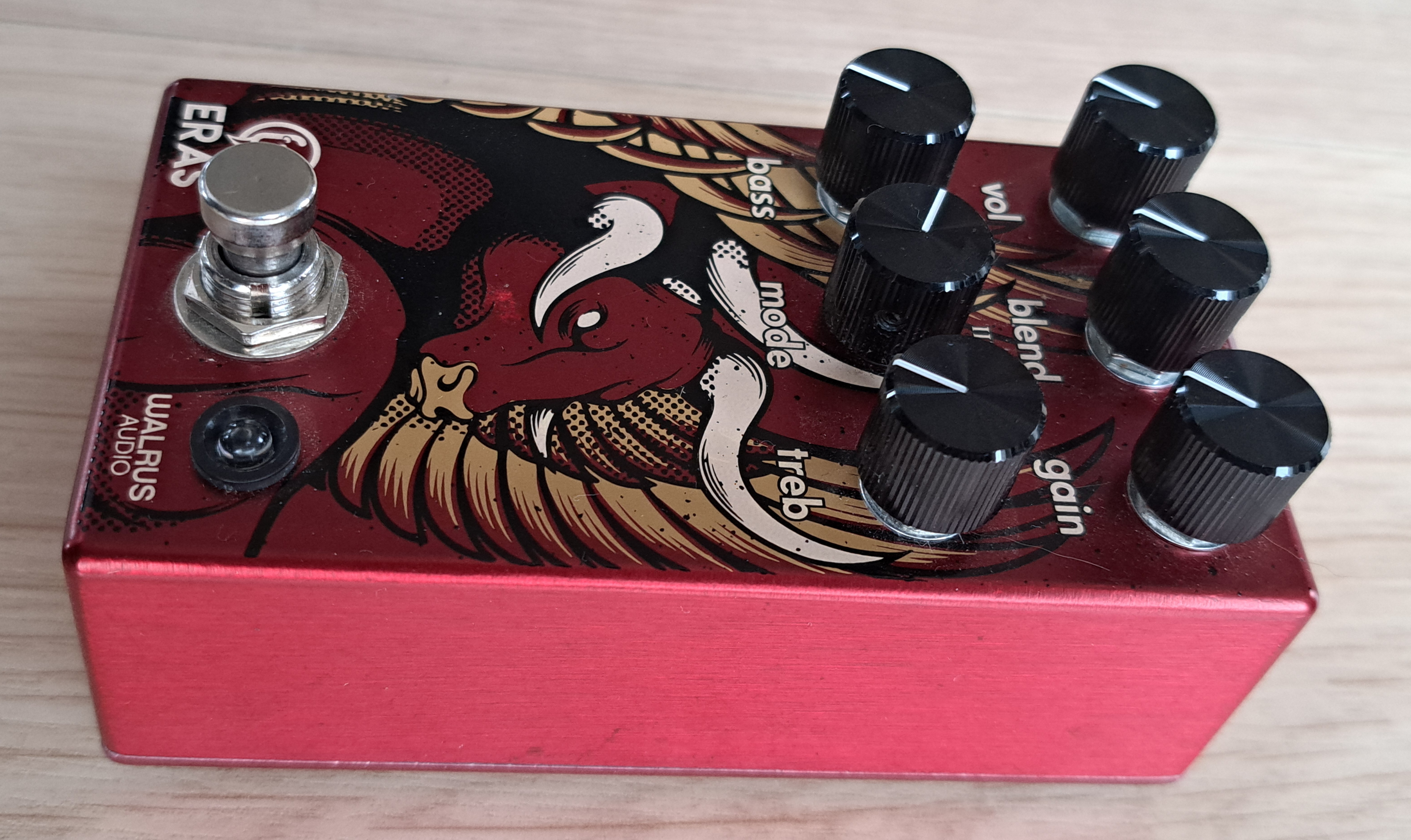 À vendre une pédale de distortion Eras de la marque Walrus Audio pour guitare et basse :La pédale dispose des contrôles Volume, Blend Gain, Bass, Mode et Treble. Le réglage Blend permet d’effectuer une balance en volume entre le son saturé et le son clair. En le plaçant sur sa position maximale, on n’entend que le son saturé. Les réglages Bass et Treble sont actifs et permettent de booster ou couper les fréquences basses et aigües avec beaucoup de précision afin d’adapter la pédale à n’importe quel micro. Le réglage Blend sera particulièrement utile si on souhaite utiliser la pédale avec une basse.