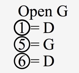 | Dans cet exemple, l’accordage en open de sol nécessite de baisser la 1re, la 5e et la 6e corde d’un ton chacune, on passe alors de EADGBE (Mi-La-Ré-Sol-Si-Mi) à DGDGBD (Ré-Sol-Ré-Sol-Si-Ré). |