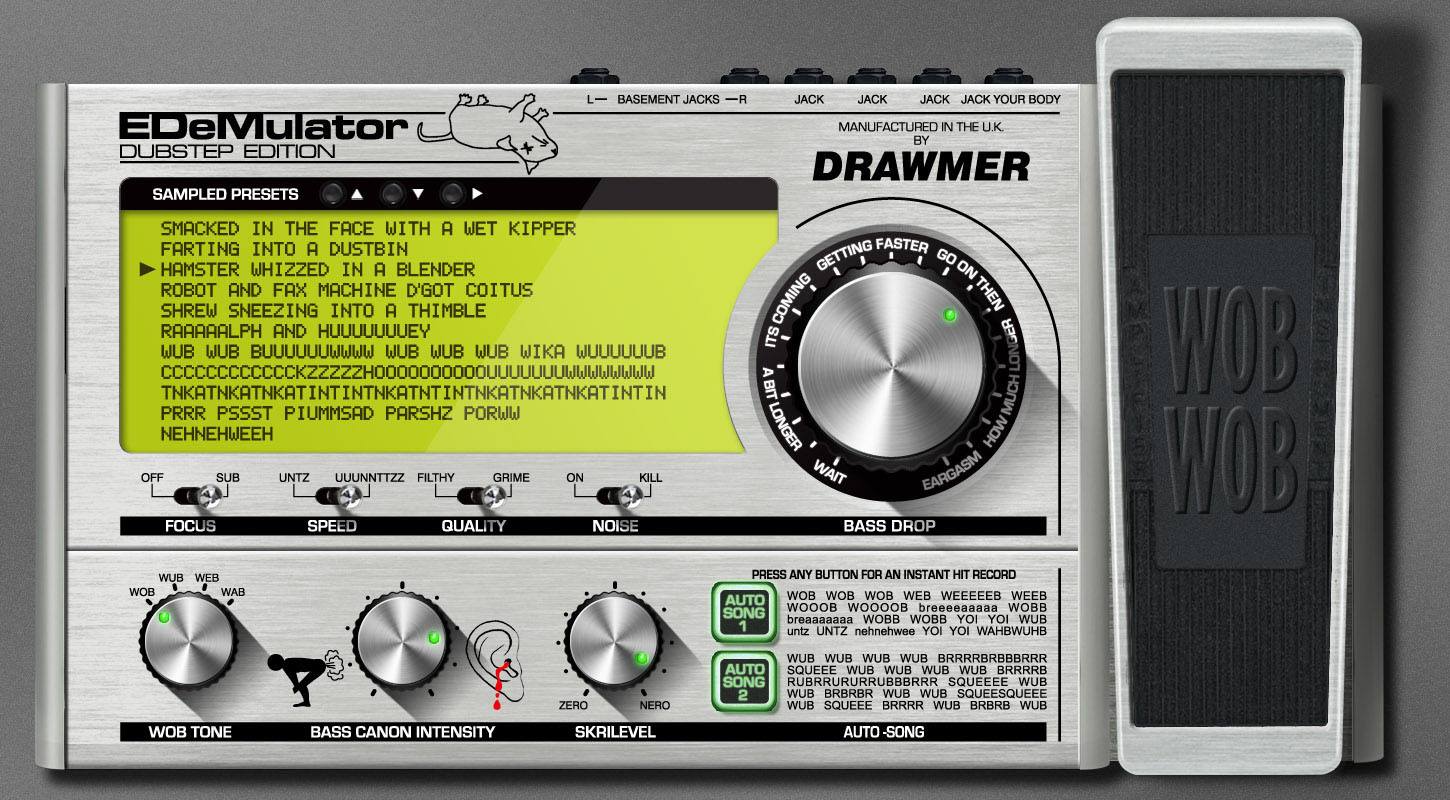 La pédale dispose de trois potards pour le son du Wob (va de Wob à Wab), l’intensité du canon de basse (peut aller jusqu’au saignement d’oreilles, à manier avec précaution), et le niveau de Skri (de zéro à Nero, mais pas celui qui travaille dans nos bureaux). Un large potard Bass Drop permet de régler le temps de l’effet (de Wait à Eargasm en passant par Getting Faster) et quatre switches Focus, Speed, Quality et Noise sont inclus, ainsi que deux boutons Auto Song. Bien entendu, la pédale est livrée avec une belle collection de presets.