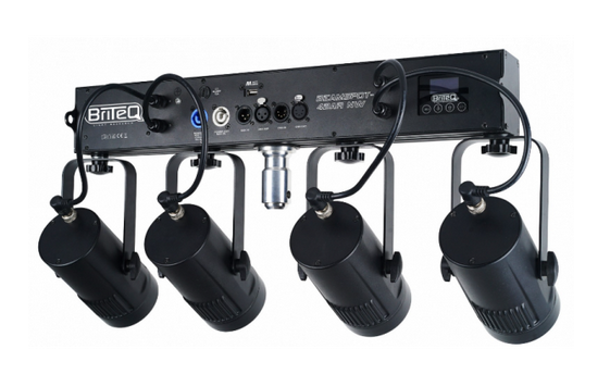 Cette barre de 4 spots DMX blancs, compacte, est équipée de quatre projecteurs de 15W à angle très étroit de 4°.