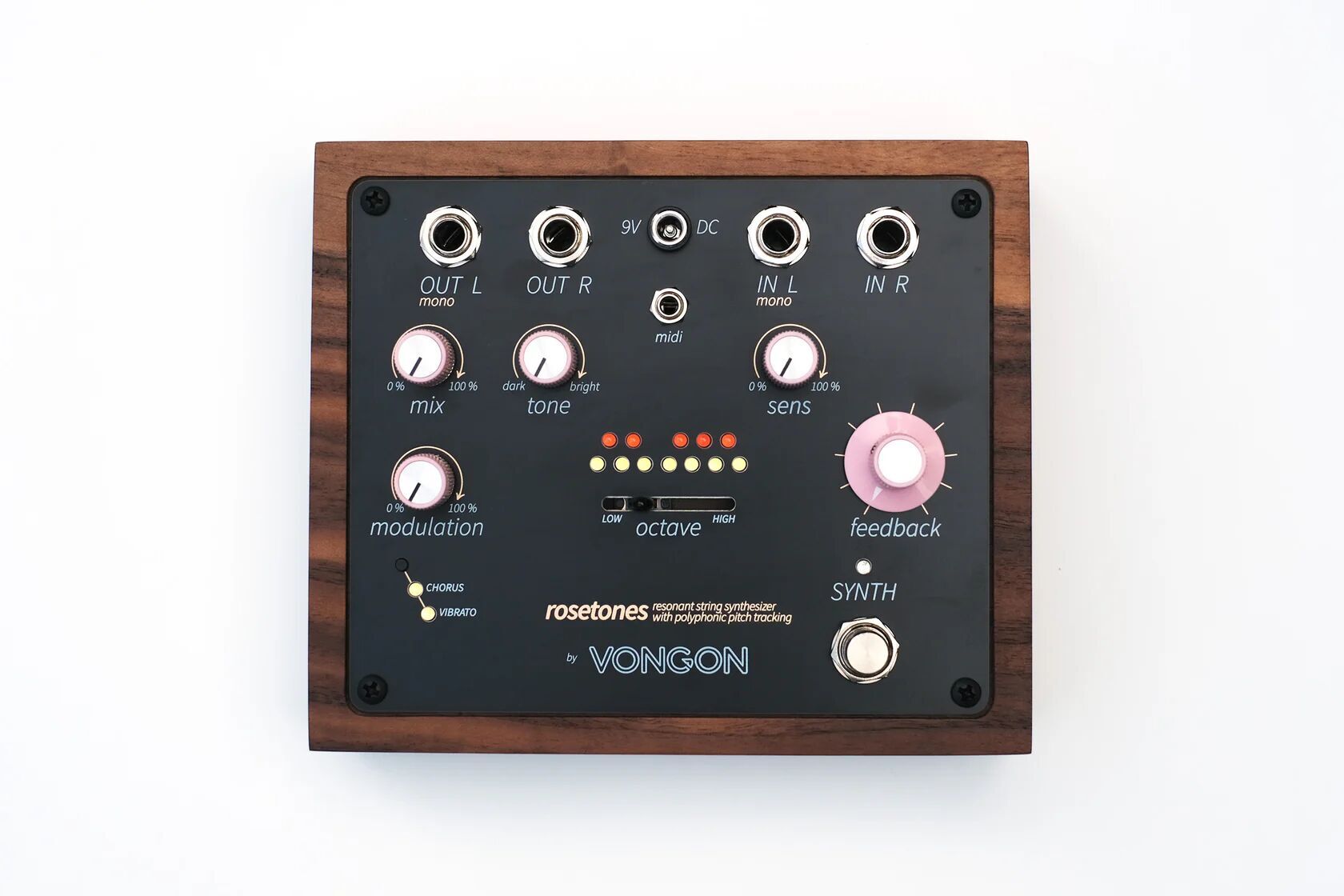 La marque californienne Vongon vient donc d’ajouter une pédale de synthé à son catalogue. Comme les autres réalisations de la marque, elle est abritée dans un joli châssis en bois qui rappelle ceux des premiers synthés analogiques. La rosetones track le jeu du guitariste et l’utilise pour déclencher un son de synthé. L’originalité de la rosetones réside dans son oscillateur qui est en fait une banque de douze voix chromatiques qui envoie les notes détectées vers des lignes de délai. Chaque note excite un résonateur auquel on peut appliquer du sustain ou un effet de swell.