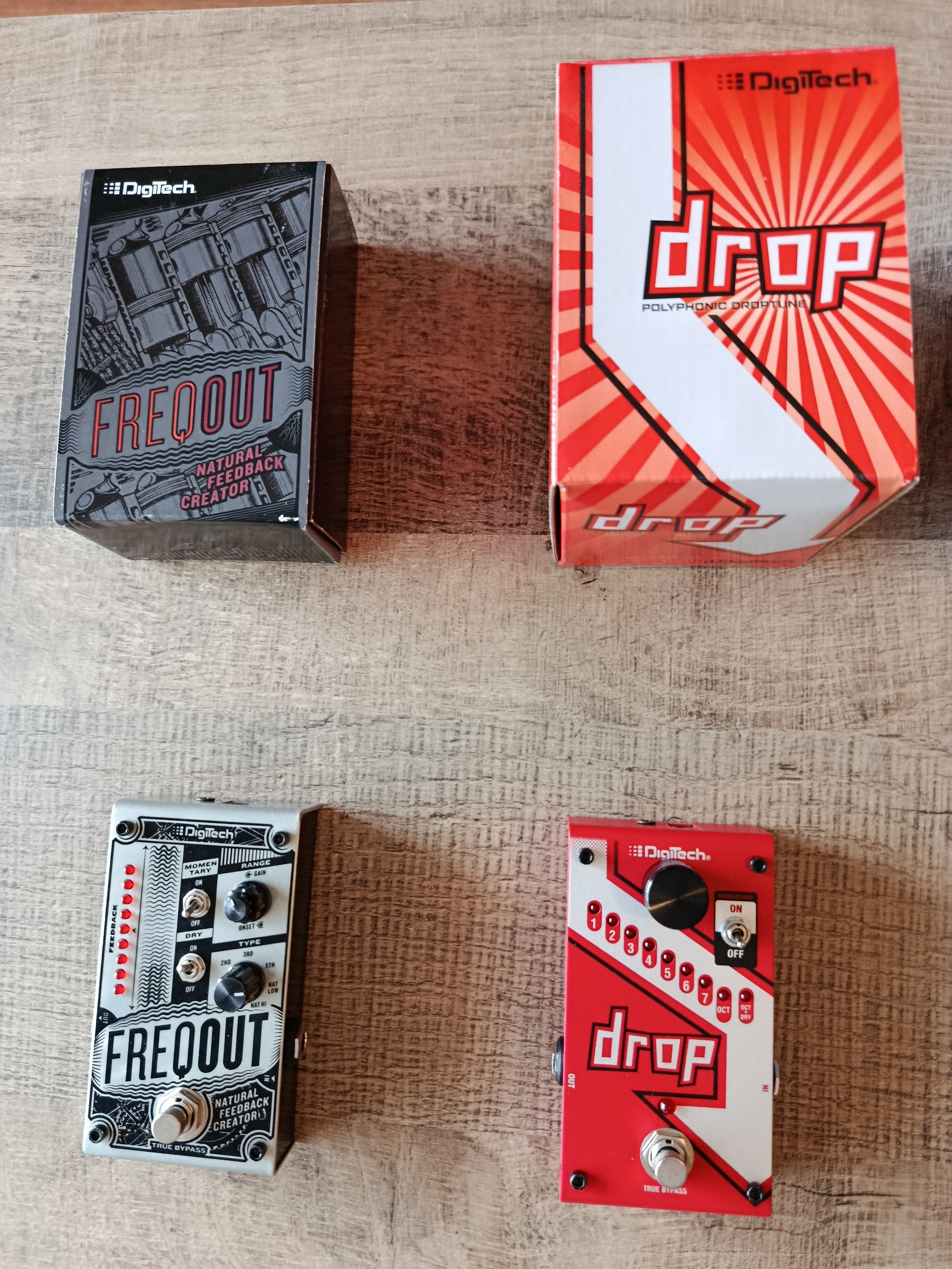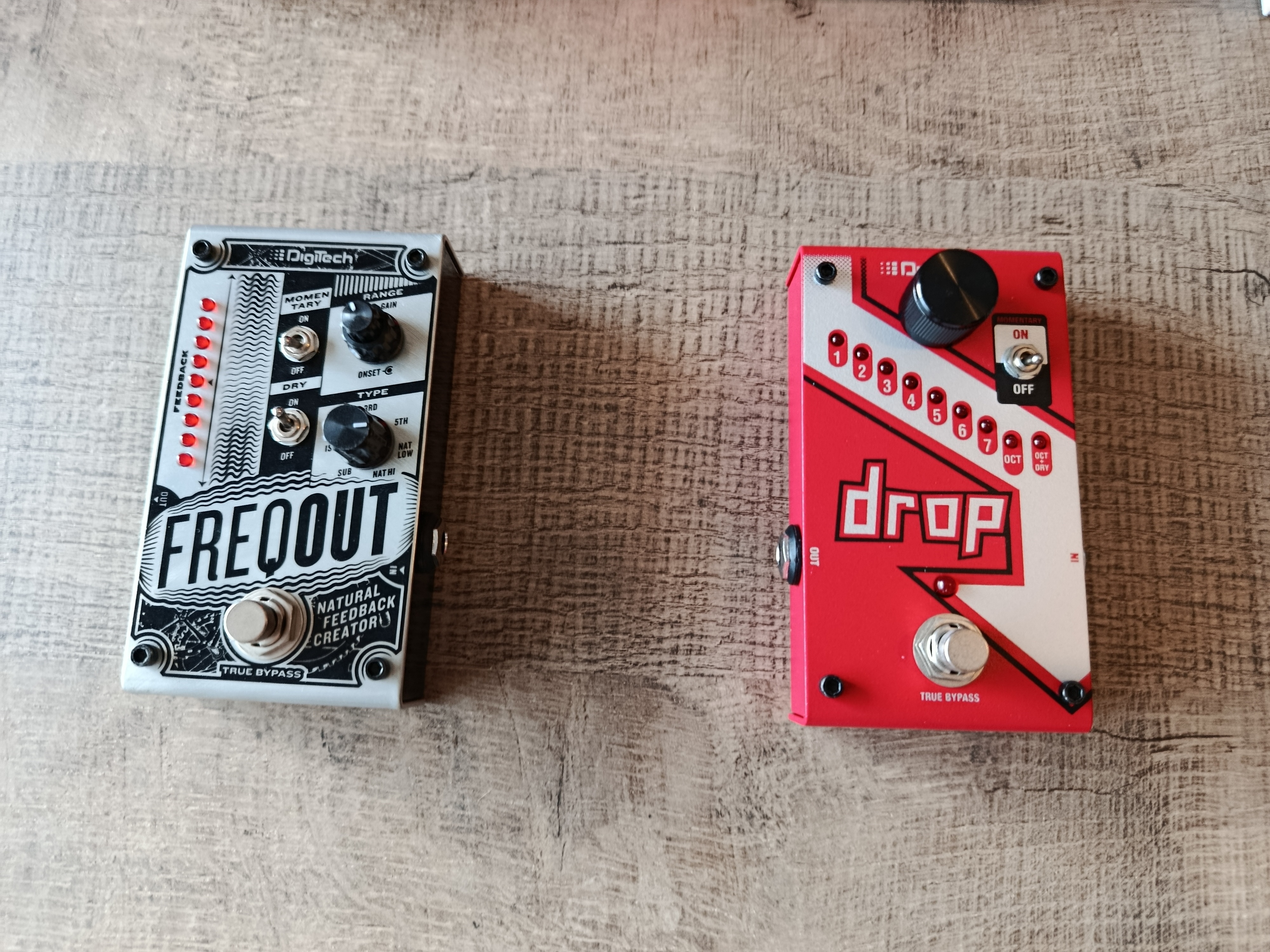 Je vends ces pédales d'effets pour guitare :- Digitech FreqOut (feedbacker) : 120 €