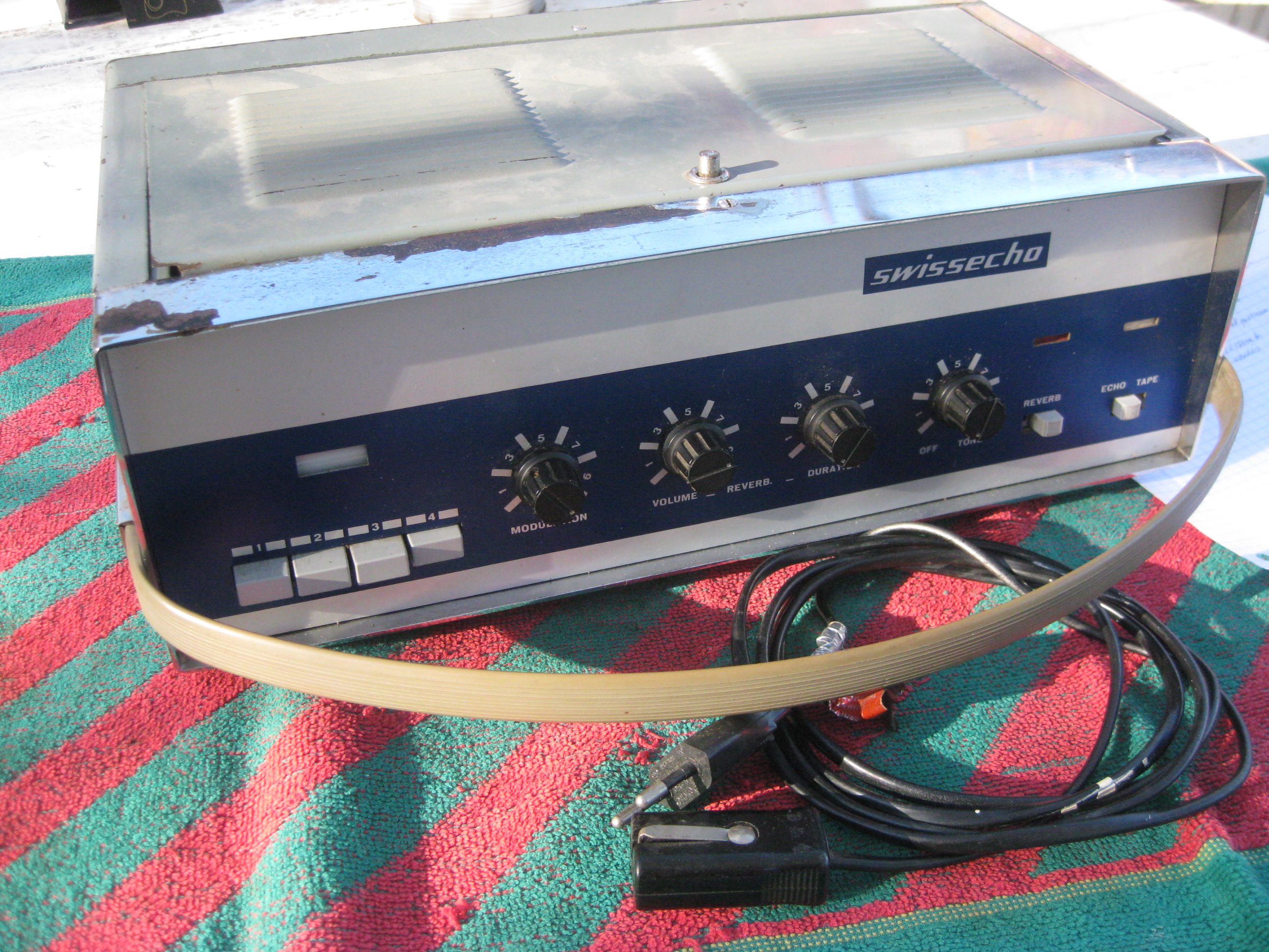 Voici un écho à bande entièrement à lampes, très rare, fabriqué par Uniton en Suisse.Le modèle Swissecho 566 figurait au catalogue Selmer entre 1962 et 1965 environ.