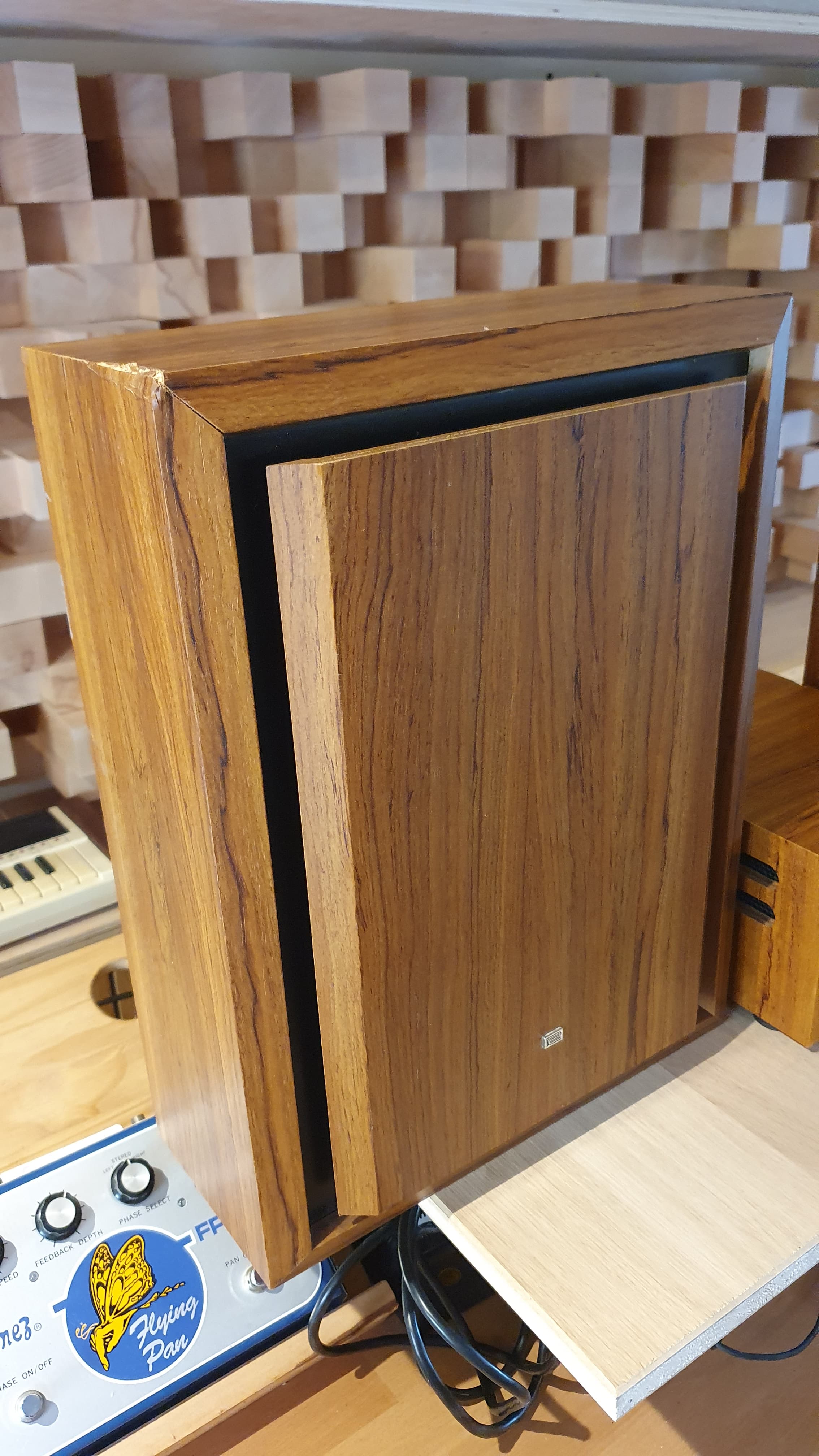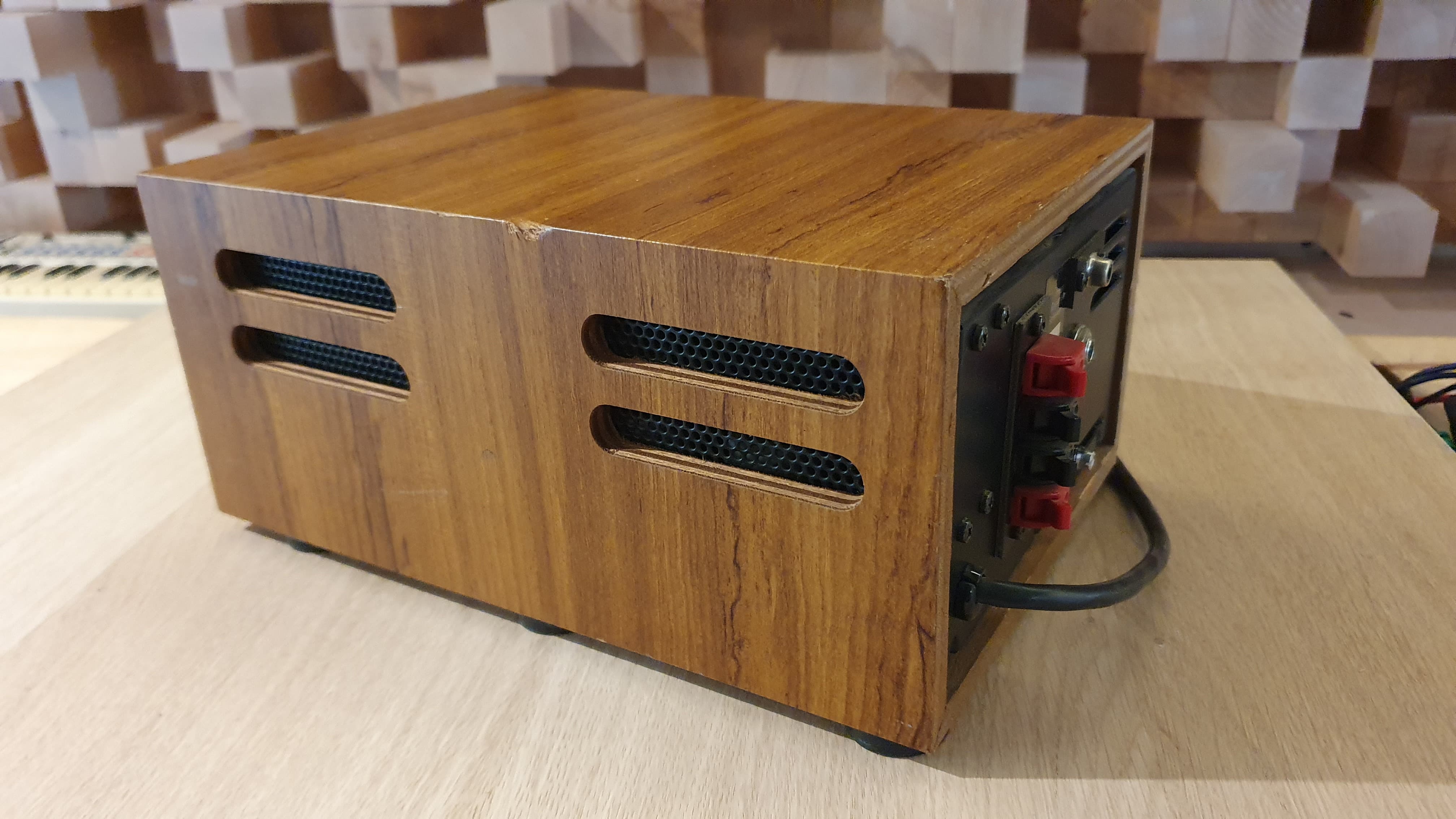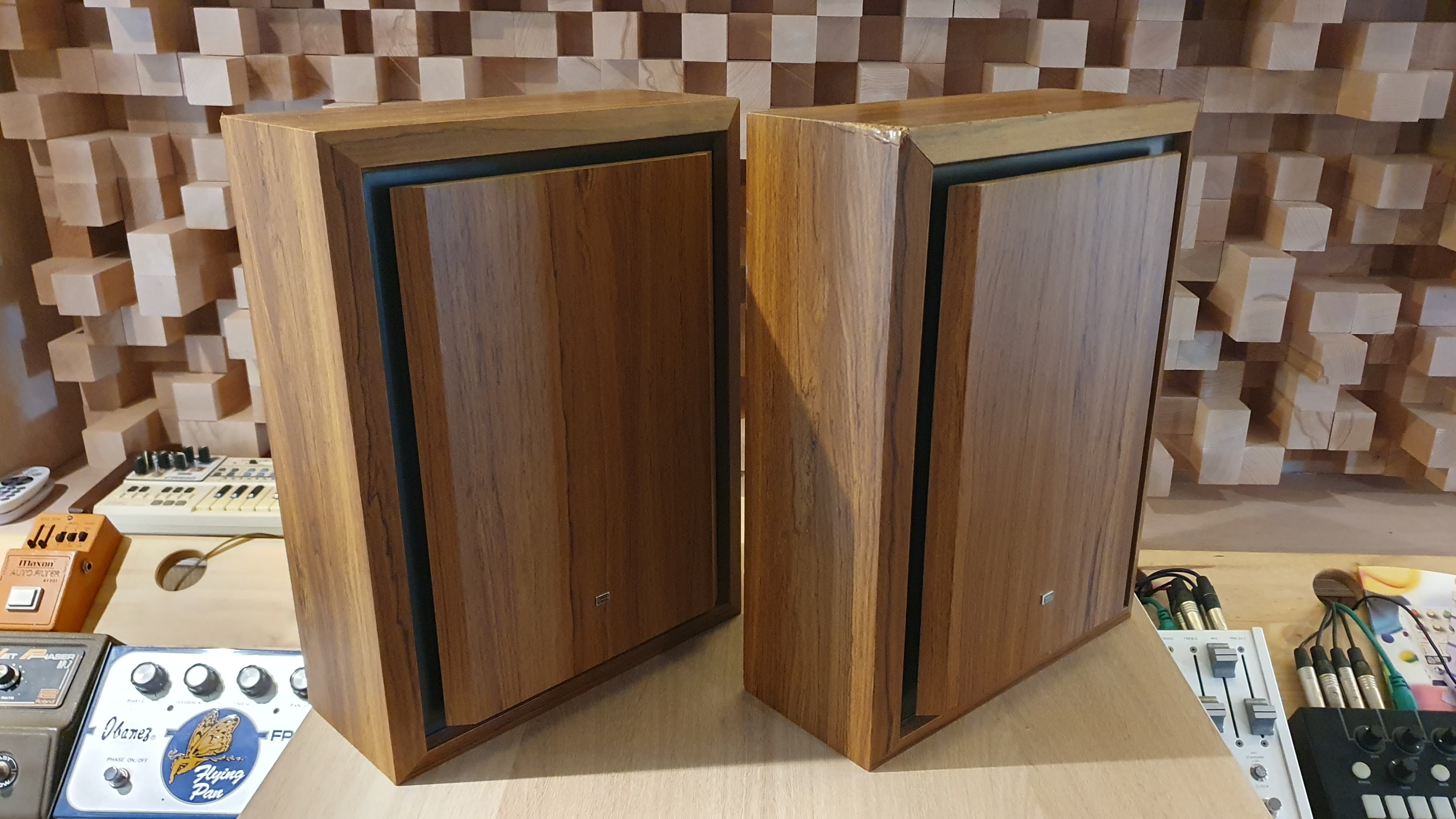 En très bon état pour son âge, il y a cependant 2 défauts esthétiques à noter : 1 coup sur l'angle supérieur d'une enceinte, et un petit coup sur la tranche supérieure droite de l'ampli (voir photos). N'affecte en rien le bon fonctionnement de l'ensemble. Utilisé en studio pro, non fumeur et climatisé.