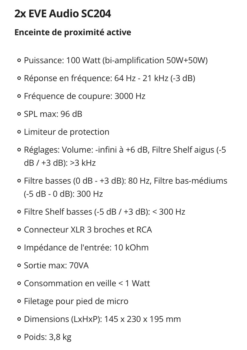 Une paire EVE Audio SC 204 - Très bon état - excellentes enceintes de monitoring pour petite cabine.