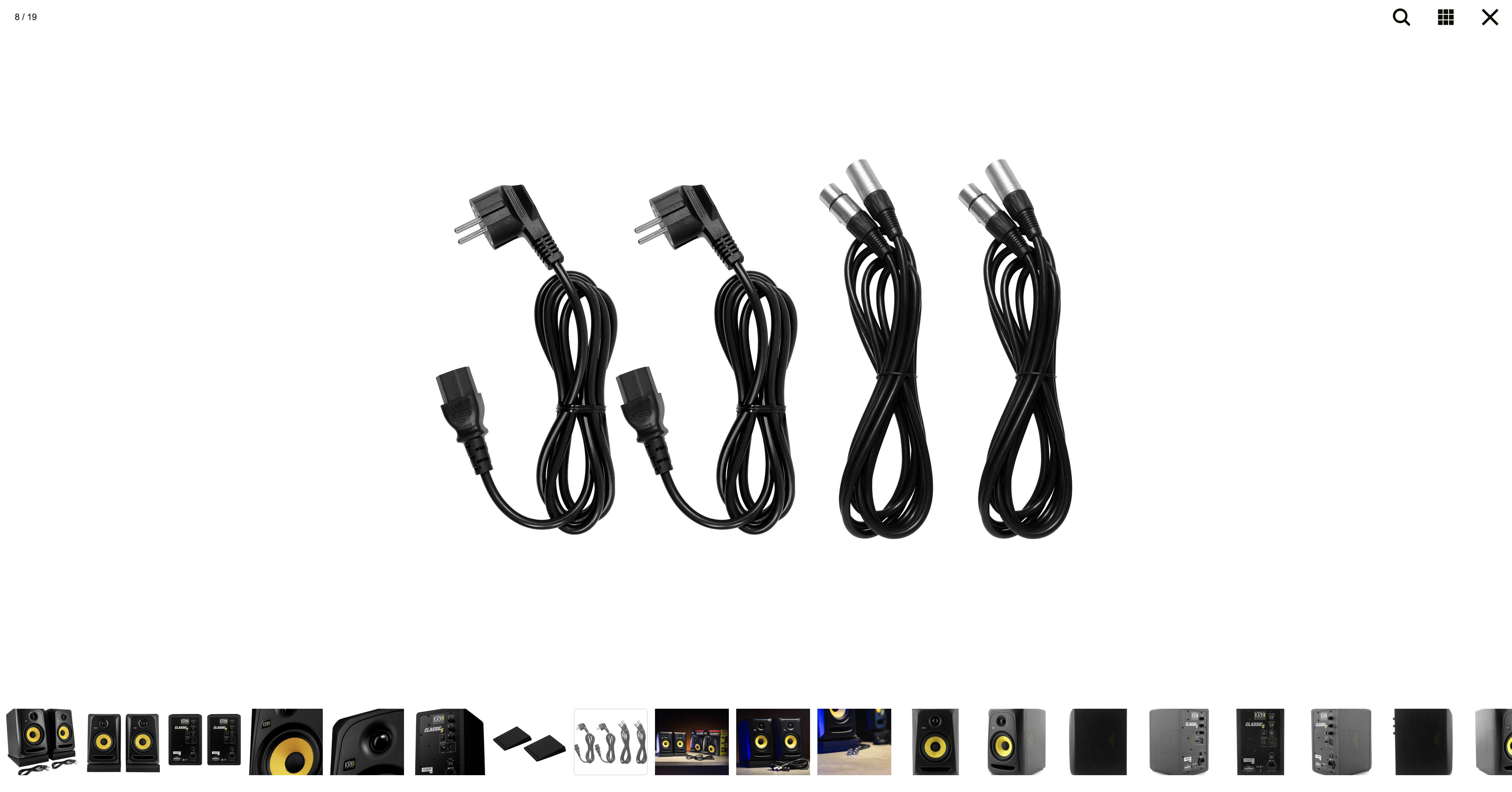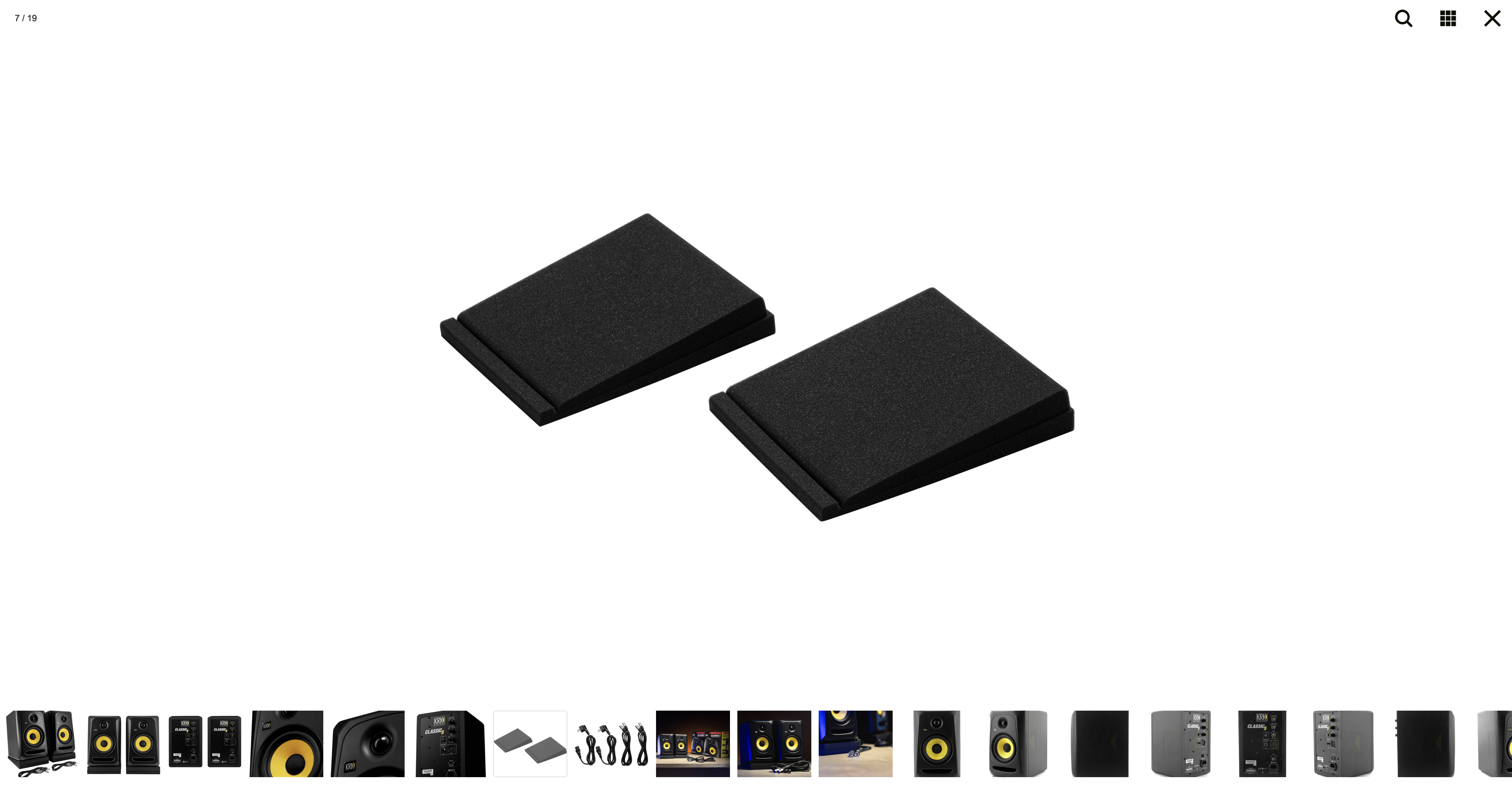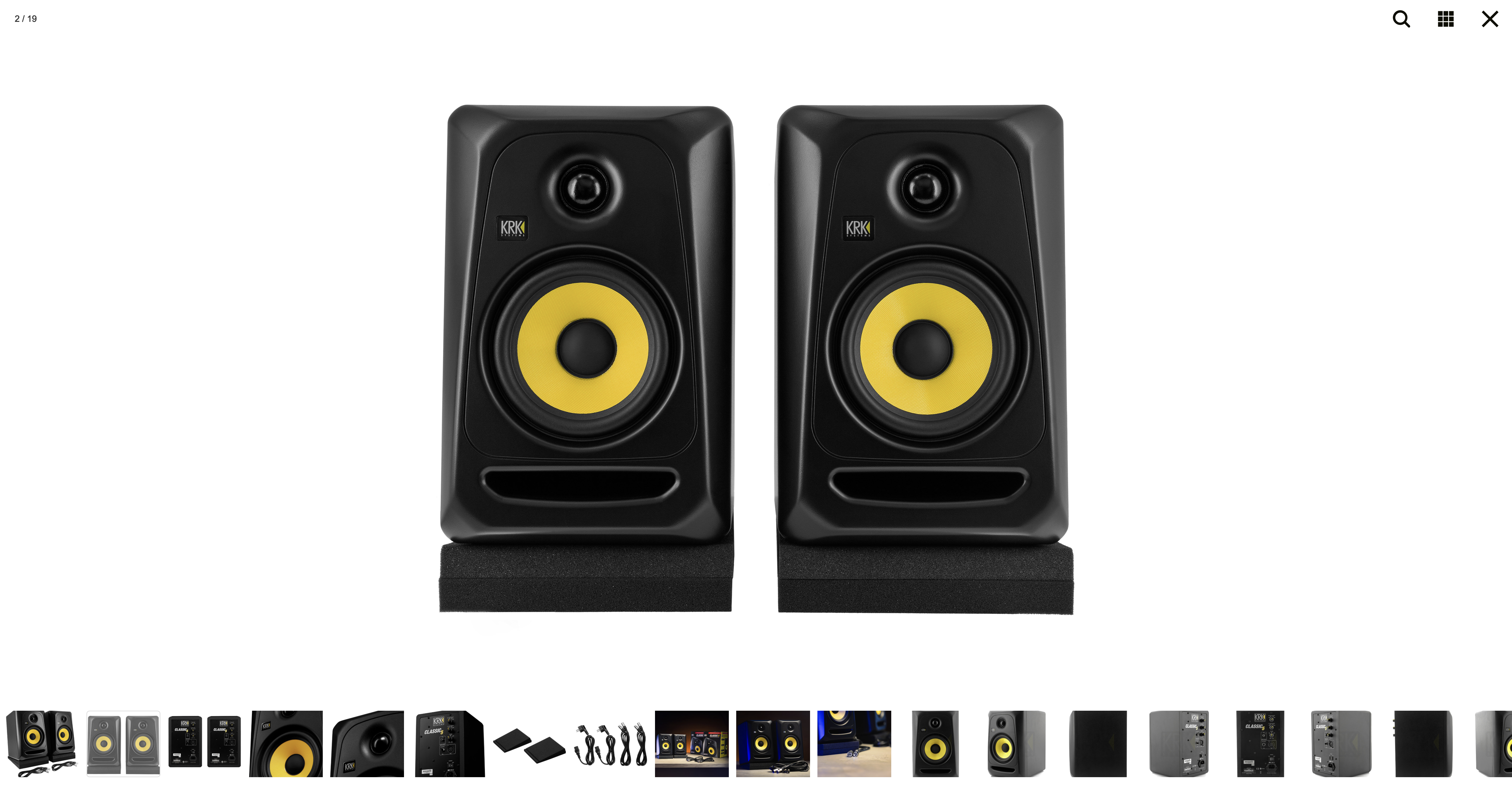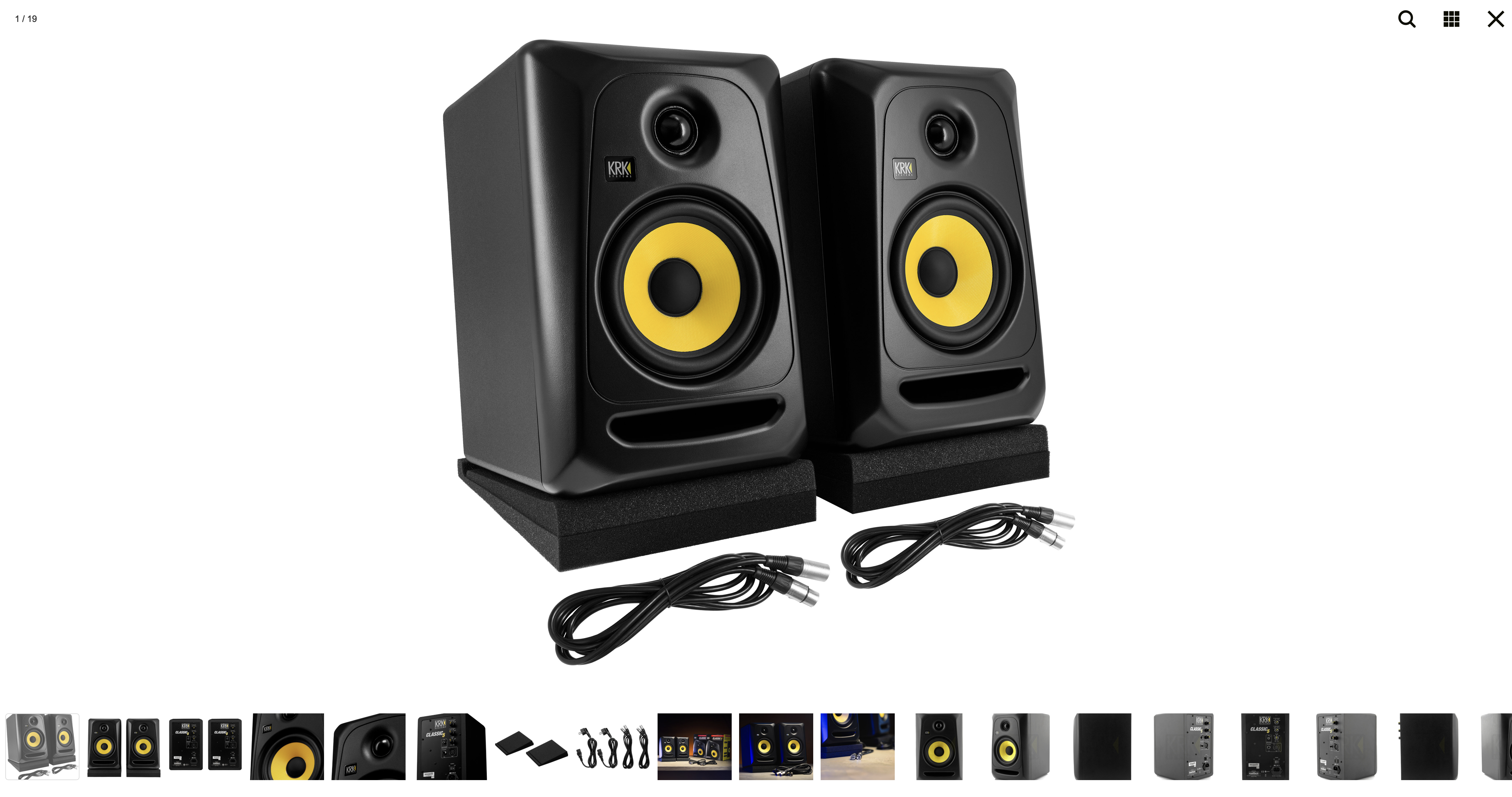Lot de 2 enceintes de monitoring KRK CLASSIC 5, fournies avec deux câbles XLR et un lot de mousses d'isolation.