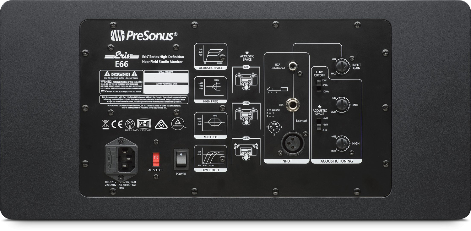 À l’arrière des Eris E44 et E66, PreSonus a intégré différents contrôles, notamment un switch Acoustic Space à trois positions pour compenser le boost des basses lorsque les enceintes sont placées près d’un mur (0 dB, –2 dB et –4 dB), des réglages pour les médiums et les aigus entre –6 et +6 dB, un potard de gain et un filtre coupe-bas à trois positions (Flat, 80 Hz et 100 Hz) que vous pourrez utiliser si vous ajoutez un subwoofer à votre configuration.