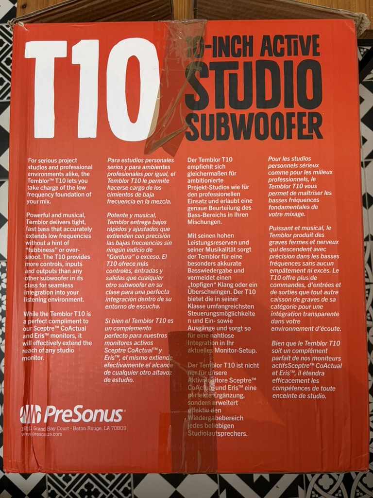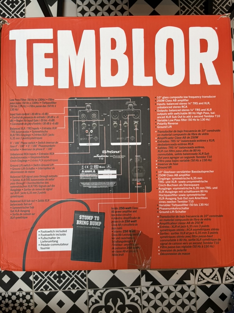 Le caisson de basses Presonus Temblor T10 est en très bon état -esthétique et fonctionnel, avec sa boîte d'origine, l'alimentation et une pédale footswitch de bypass (permettant d'activer ou désactiver le caisson en un clic, très pratique au quotidien). Je n'ai pas le mode d'emploi mais il est disponible sur Internet, je peux vous l'envoyer en PDF.