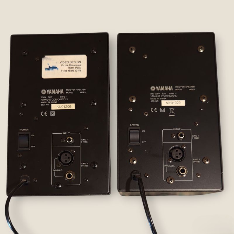 Je mets en vente une paire d’enceintes de monitoring Yamaha MSP3, réputées pour leur précision et leur fiabilité.Son clair et équilibré, idéal pour le home-studio, le mixage ou l’écoute de compact, facile à installer dans n’importe quel espace.Entrée Jack et XLR pour s’adapter à différents équipements.