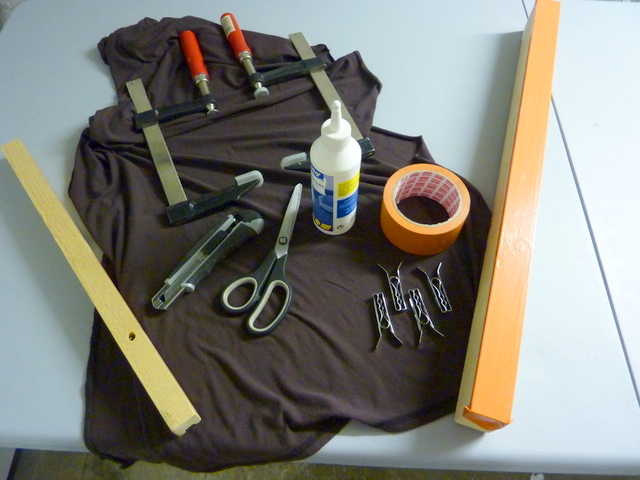 Pour ce faire, il faut deux morceaux de bois, le premier de la même épaisseur que celle du cadre, qu'on va placer contre ce dernier et le second qui viendra par dessus, à cheval sur le tissu encollé et la cale de bois. Il sera muni d'une bande de scotch de chantier afin que la colle n'y prenne pas et permettre ainsi son décollage.