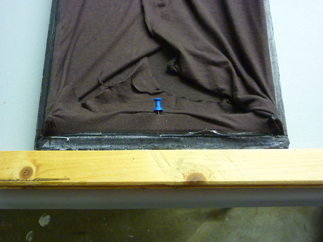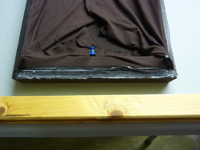 J'aurai pu choisir de la colle néoprène, en une fine couche, mais j'ai eu peur qu'en vieillissant elle ne sèche et tombe en poussière. J'ai préféré de la colle à bois qui sait très bien fixer du tissu sur du bois, pour longtemps. Il faut être assez généreux pour qu'elle traverse le tissu et fasse un bloc après séchage, ce qui est visible sur les deux côtés déjà encollés et secs :