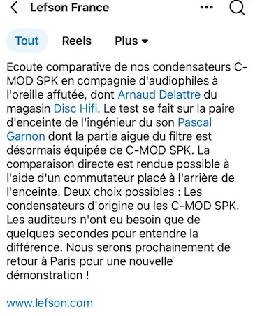 Modification sur le filtre avant le tweeter par la société LEFSON. Ajout d'un condensateur haut de gamme C_MOD SPK. Possibilité de commutation du condensateur avant le tweeter soit sur le modèle d'origine soit sur le C_MOD SPK via un commutateur à bascule ( voir photos )
