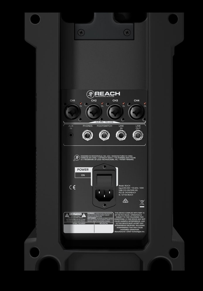 La section de mixage numérique présente 4 entrées XLR pour brancher micros, guitare, claviers, etc., une entrée auxiliaire sur mini-jack 3.5 mm, une sortie casque sur jack 6.35 mm, une sortie Link pour brancher une seconde enceinte Reach, un jack pour footswitch, ce dernier permettant le contrôler l’activation/désactivation des effets, et la connectivité Bluetooth permet d’appairer un dispositif iOS ou Android pour lire de la musique ou utiliser l’appli de mixage Mackie Connect.
