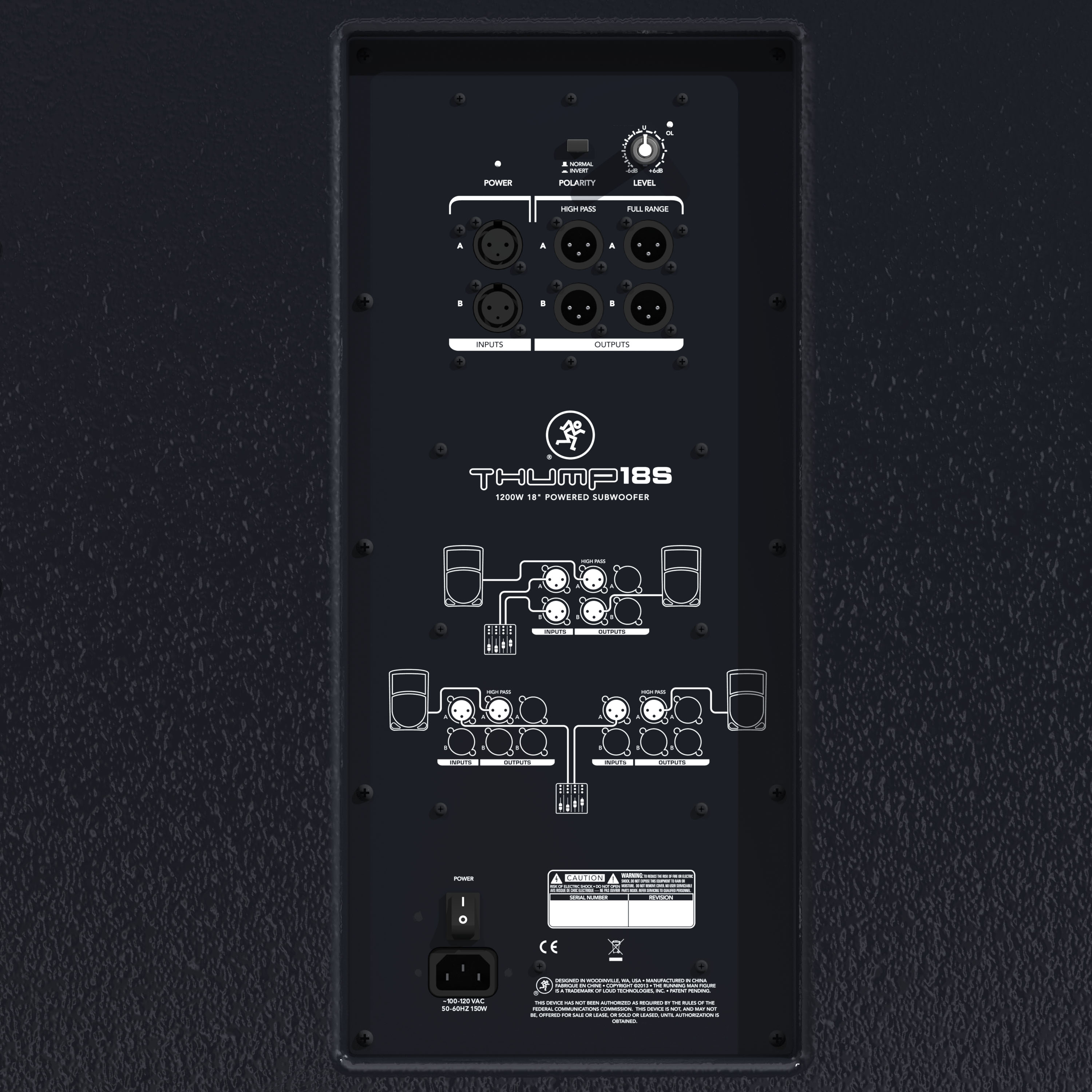 Le subwoover Thump18S embarque quant à lui un woofer de 18” à aimant en ferrite et cône en papier, dans un caisson entièrement en bois. La fréquence de crossover est à 140Hz, la réponse en fréquence va de 40Hz à 120Hz (-3dB) et le SPL maximal de 130dB. Vous trouverez sur le caisson une paire d’entrées sur XLR et quatre sorties XLR, il sera ainsi possible de sortir en mono ou en stéréo en configurations Full Range ou High Pass avec d’autres enceintes de sono ou pour chaîner plusieurs subwoofers. Un switch d’inversion de la polarité accompagne le réglage de niveau à l’arrière.