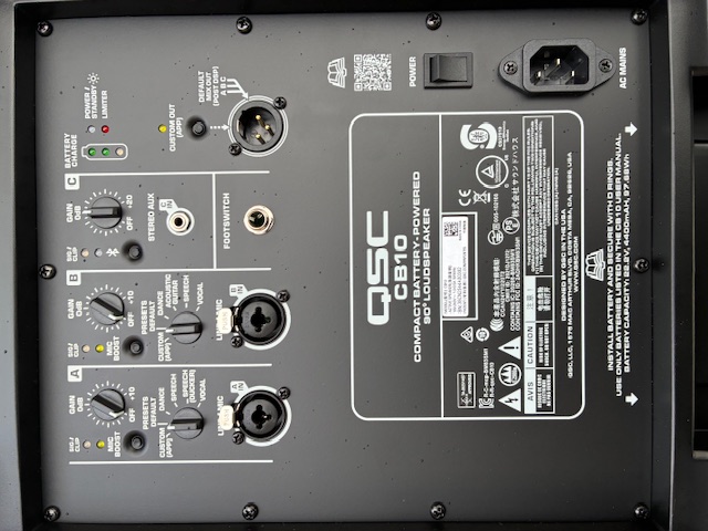 En ce qui concerne les connexions, vous pourrez profiter de deux entrées micro/ligne (combo XLR/Jack), d’une entrée auxiliaire (mini-Jack stéréo 3,5 mm), d’une sortie Mix (XLR à trois broches) et enfin d’une embase pour footswitch/pédalier (Jack 6,35 mm). Vous retrouverez aussi un port Bluetooth 5.1 compatible avec la norme TWS (True Wireless Stereo) pour l’appairage de plusieurs CB10. La batterie incluse offre une autonomie estimée à douze heures (en fonction des conditions d’utilisation) et présente un temps de recharge d’environ quatre heures. Le châssis est fabriqué en résine thermoplastique (polypropylène) et dispose d’une poignée de transport. Il offre une option d’inclinaison de trente degrés vers l’arrière en configuration de retour (enceinte posée au sol), et, enfin, ses dimensions sont de 465 × 313 × 287 mm pour un poids total de 12,2 kg. L’enceinte est compatible avec l’application de contrôle propriétaire QSC Loudspeaker Control et la marque fournit une garantie constructeur de six ans, en ce qui concerne le modèle en lui-même, et une garantie d’un an, en ce qui concerne la batterie. Pour terminer, l’enceinte est proposée à un prix constructeur annoncé de 799 €, ce qui la place finalement dans le milieu de gamme des modèles de sonorisation autonomes.