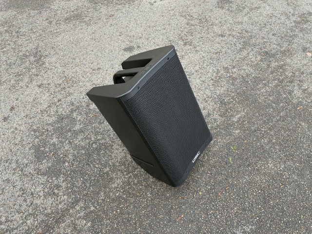 À l’ouverture du carton, on découvre une enceinte de sonorisation active et autonome, à deux voies, équipée d’un amplificateur de classe D. Sur le papier, QSC précise que sa création délivre une puissance de 440 watts (PEAK). En termes de transducteurs, on retrouve un haut-parleur de dix pouces (254 mm de diamètre) accompagné d’un moteur de compression de 1 pouce (25,4 mm de diamètre). La réponse en fréquences s’étend de 51 Hz à 18 kHz pour une tolérance de –6 dB (ou 47 Hz – 20 kHz @-10 dB) et une pression acoustique maximale mesurée à un mètre de 127 dB Max SPL. L’angle de dispersion, quant à lui, est de 90° x 90° (H x V). Le module DSP propose six présets d’égalisation, une ligne de retard destiné à l’alignement temporel des enceintes (pouvant aller jusqu’à 200 millisecondes), et le mixeur intégré à trois canaux offre des contrôles de gain et un effet de réverbération numérique.