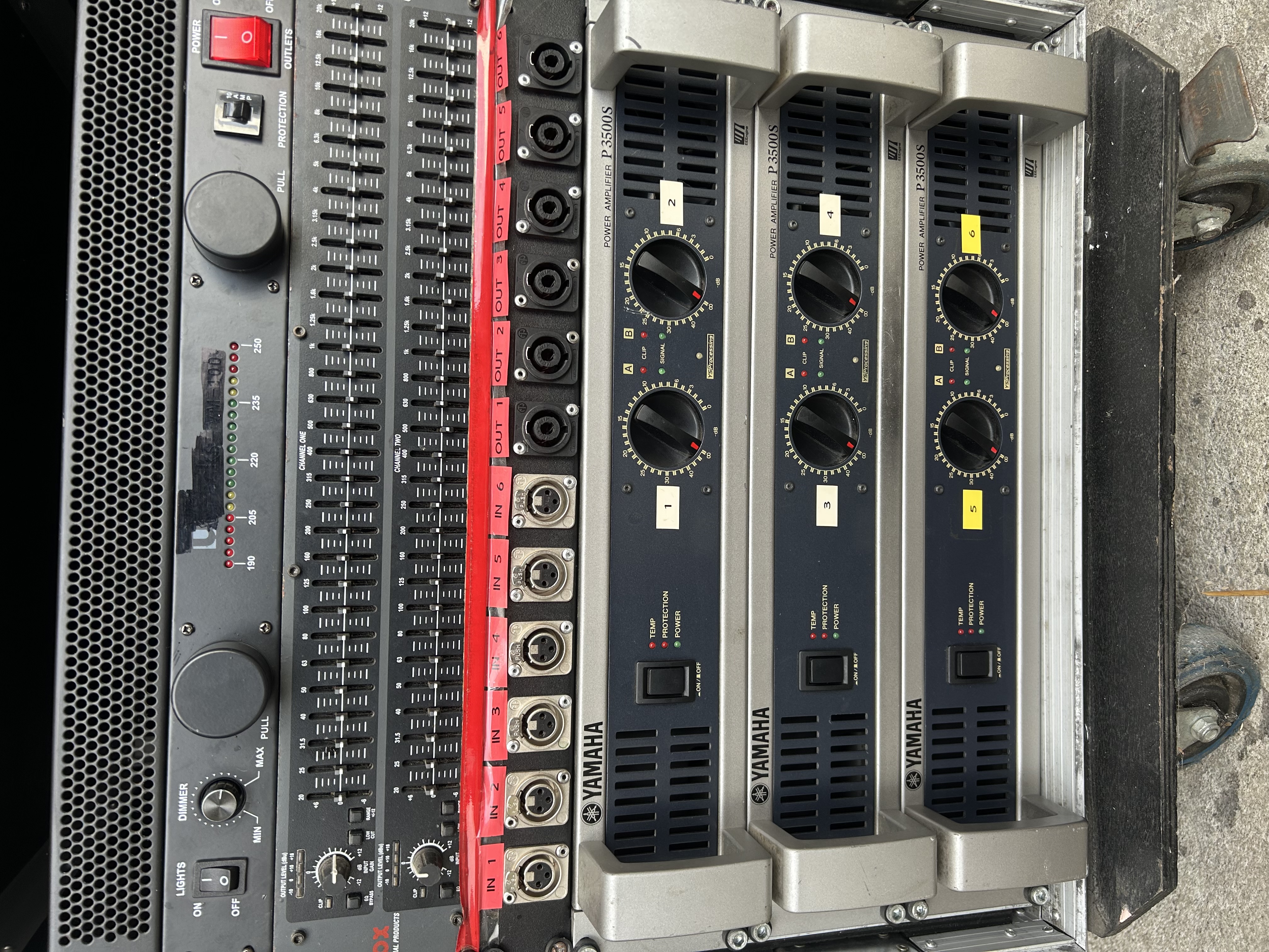 - 1 flight case roulant avec 3x amplis Yamaha P3500S ( 2x 350 W sous 8Ω / 900 W sous 8Ω en bridge. 10 Hz - 40 kHz / Technologie EEEngine & YSProcessing / Fréquence ajustable coupe bas par canal / Prix neuf : 600€ / pièce soit 1800€ les 3) + 1x bornier connectiques Ins / Outs (Speakons & XLR) (prix : 200€) + 1x EQ 1231 DBX ( 2x 31 bandes / 4x LED d'indication / Fader de 45 mm / Réponse en fréquence: 20 Hz - 20 kHz / Plage sélectionnable entre ±6 dB et ±15 dB / Prix neuf : 440€) + 1 Stabilisateur de Tension avec éclairage (prix neuf : 80€) + câblage audio & électrique complet.