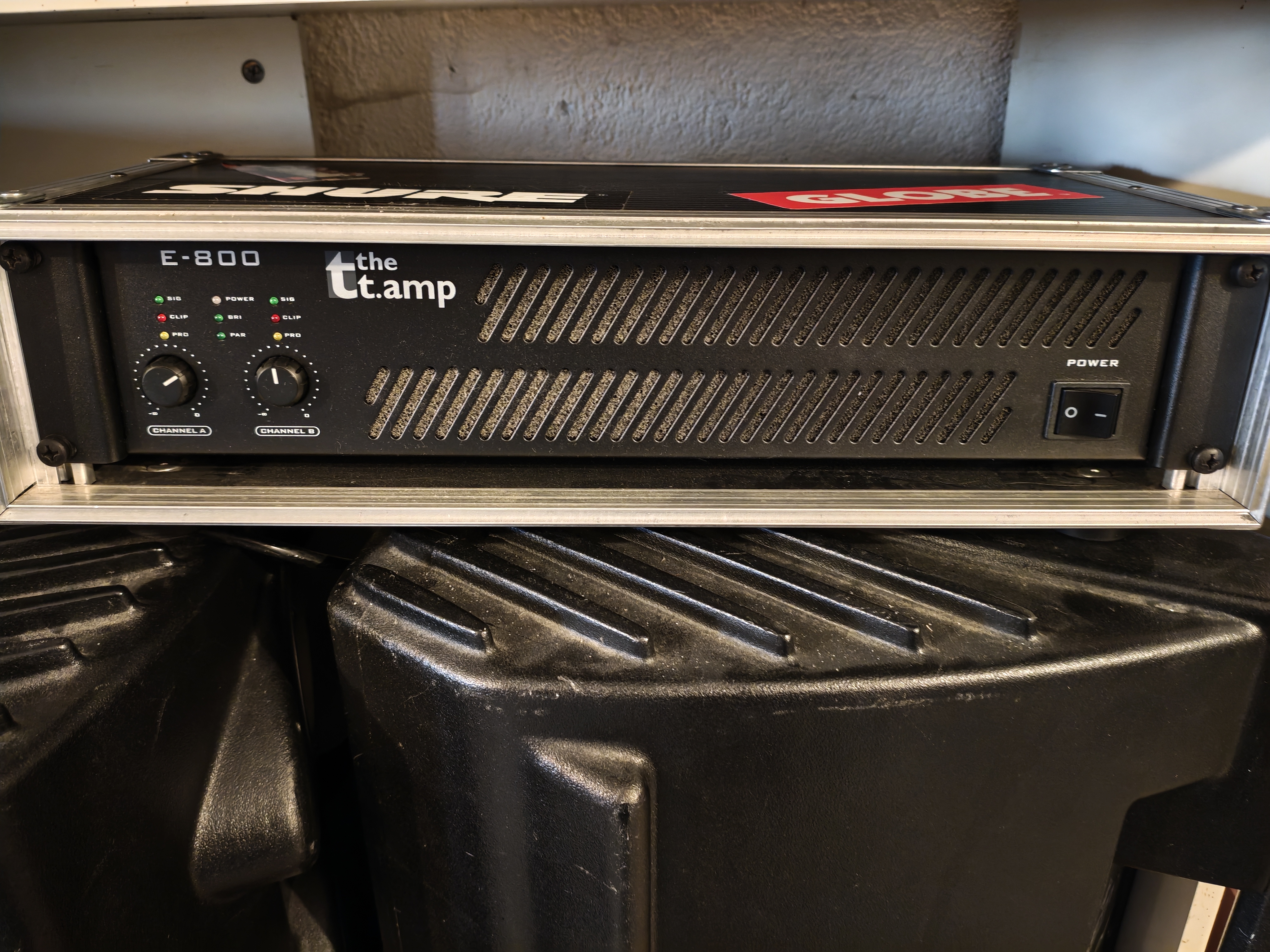 L'ampli est dans un rack qui ne couvre pas la partie arrière mais permet d'avoir une poignée de transport, très pratique.
