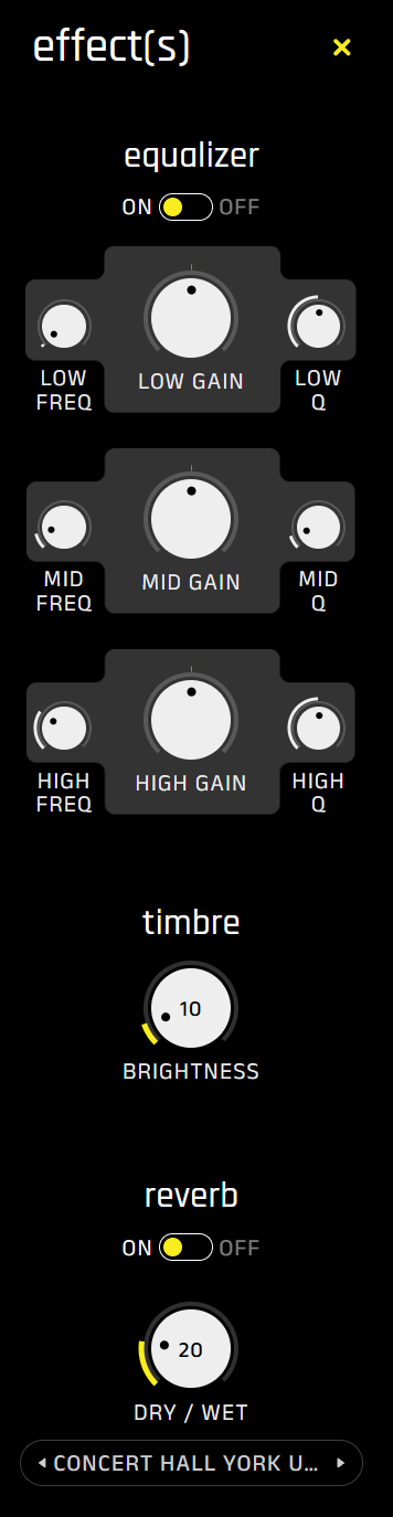 Une section d’effets est également disponible. Elle comprend un égaliseur trois bandes, un potentiomètre de timbre et une collection de réverbes disposant d’un réglage de mix. Les réverbes sont de qualité et offrent des espaces variés.