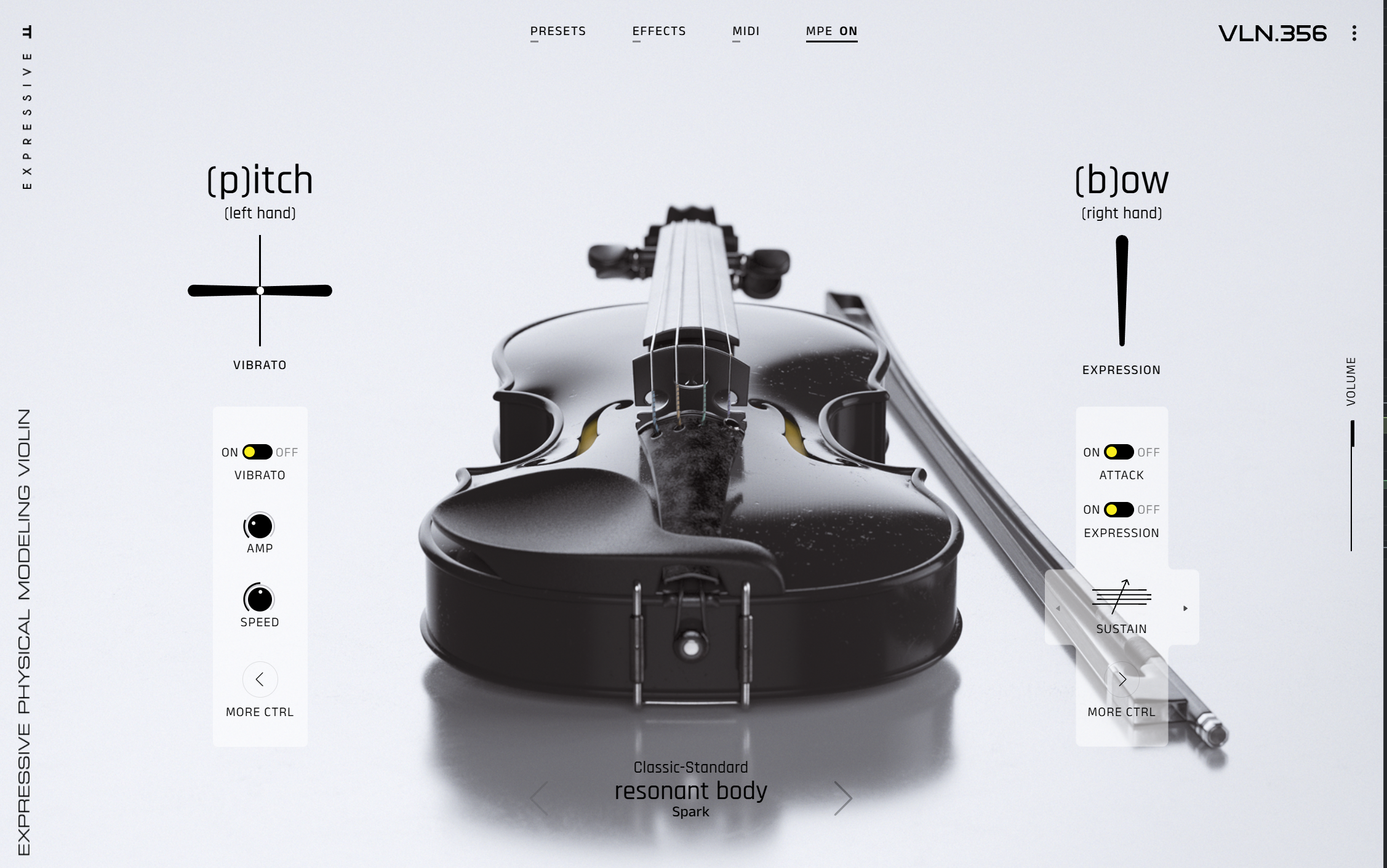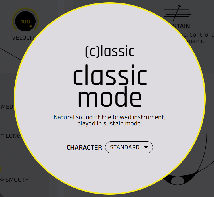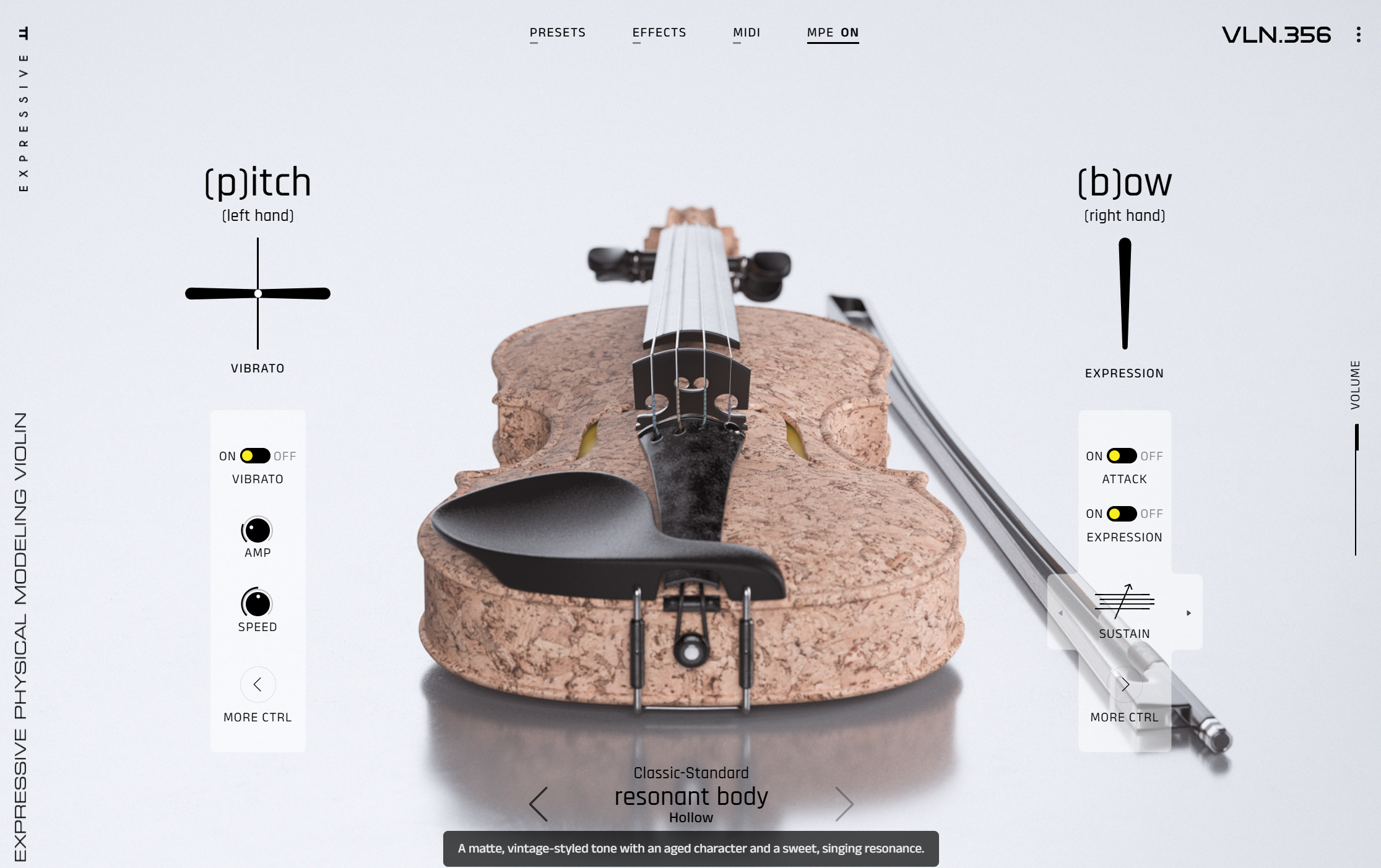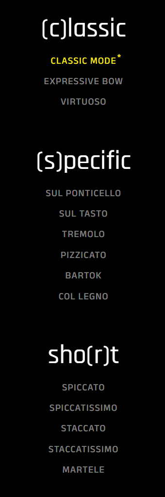 L’interface permet également de changer d’instrument, ou plus précisément de « resonant body types », afin de sélectionner un timbre et un caractère spécifiques. VLN.356 propose six variantes : spark, sleek, lyric, hollow, antique et mellow. VLA.419, CLO.756 et DBS.1130 en offrent cinq : spark, sleek, lyric, hollow et antique.