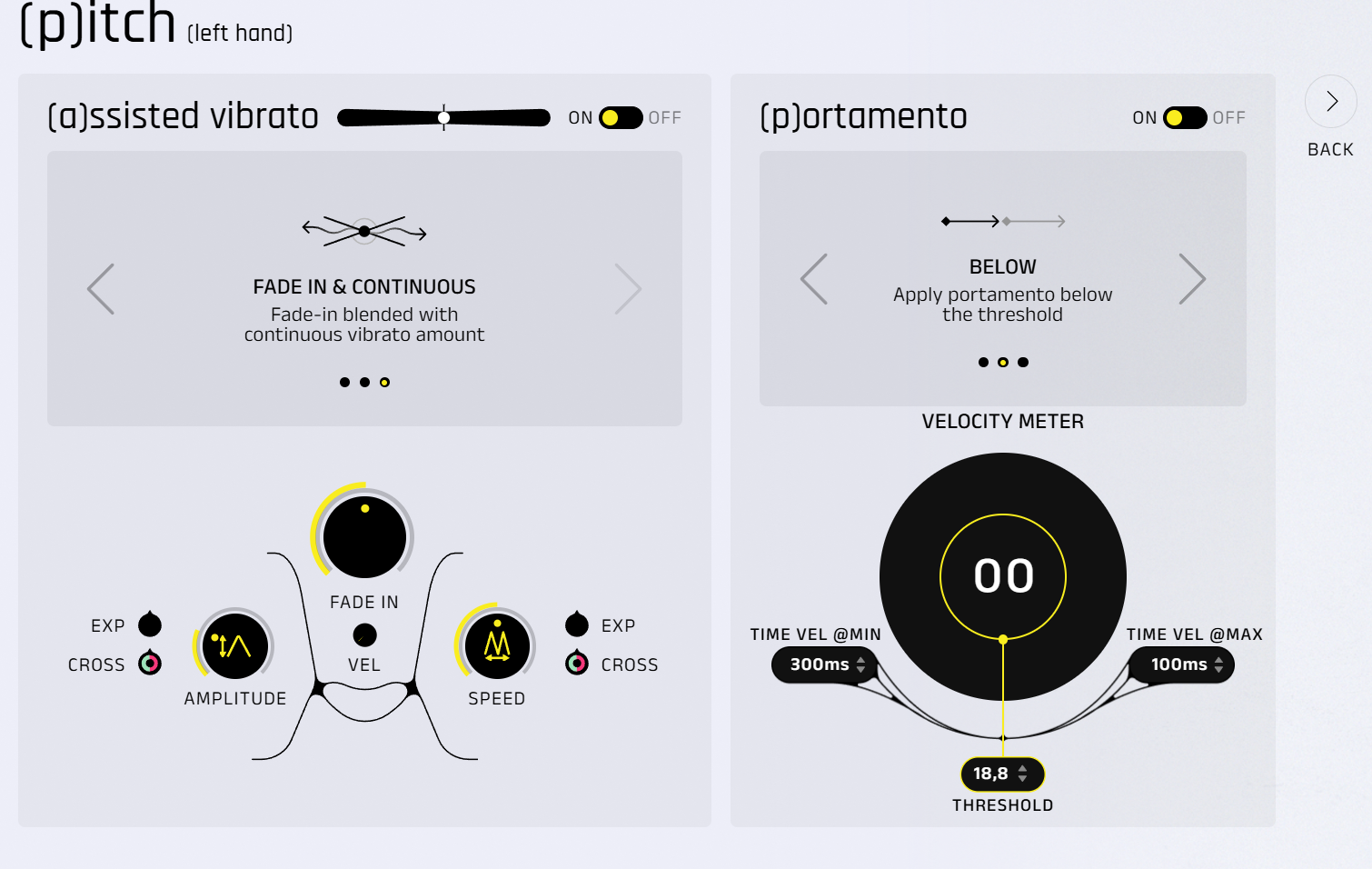 On dispose également d’un portamento entièrement personnalisable. J’ai particulièrement apprécié la possibilité de définir un seuil en dessous duquel il ne se déclenche pas, ou, à l’inverse, de l’activer uniquement à partir d’une certaine valeur de vélocité.